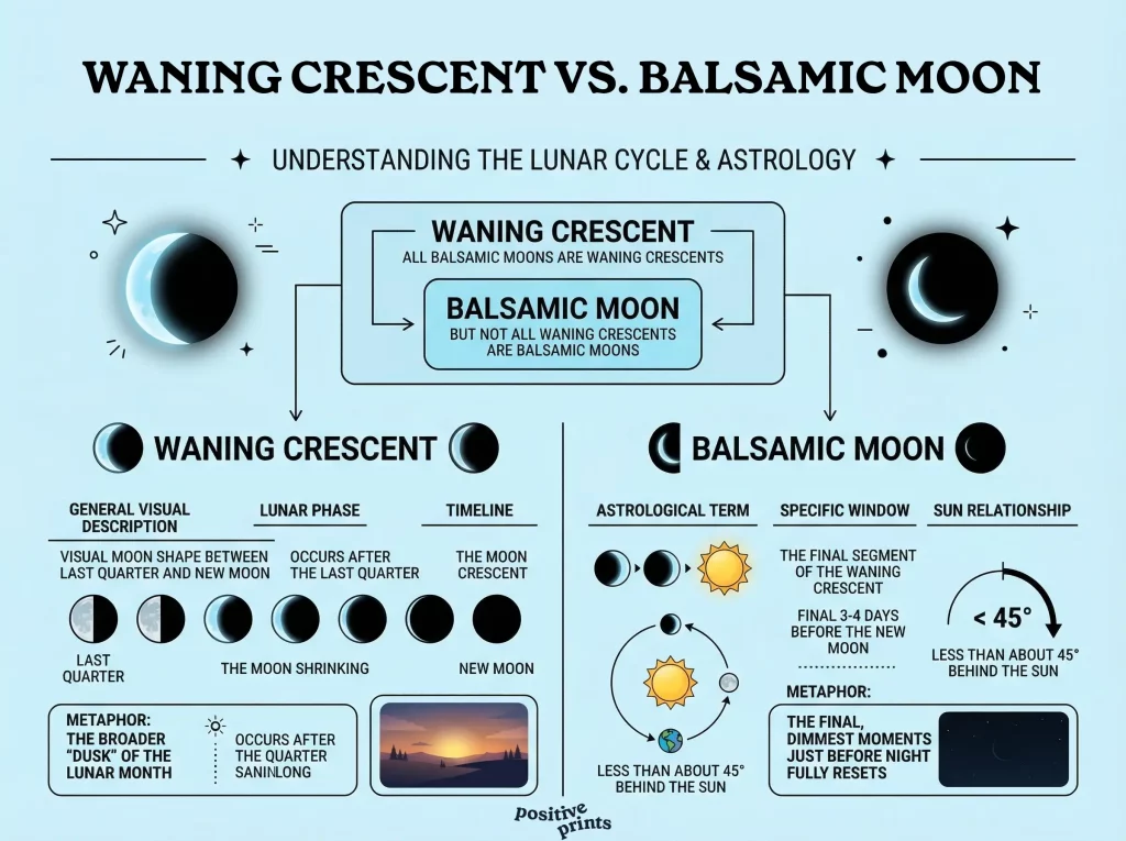 Think of the waning crescent as the broader “dusk” of the lunar month, and the balsamic moon as the final, dimmest moments just before night fully resets.