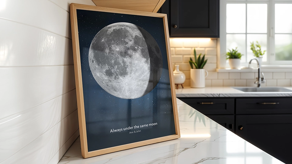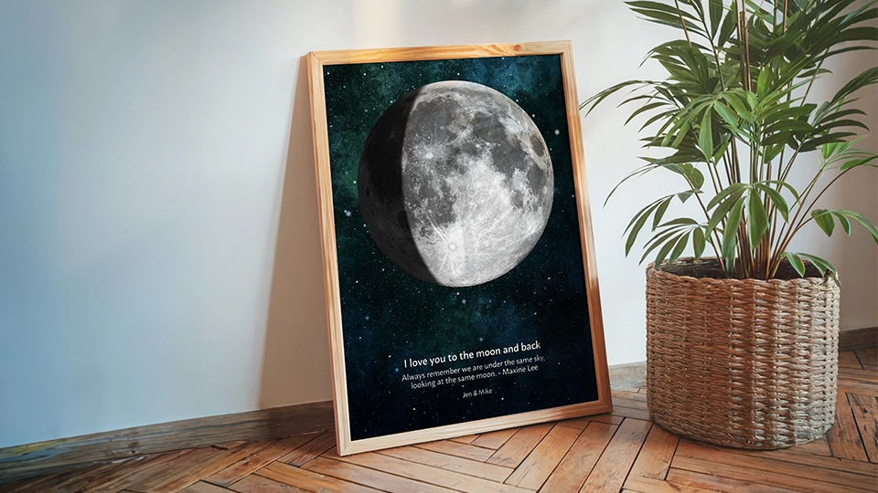Transform your moon phase discovery into a beautiful, lasting memory with Positive Prints’ exclusive collection of personalized celestial products. Our personalized moon phase posters ecreate the exact lunar phase from your birth date, creating meaningful keepsakes that celebrate your unique celestial fingerprint.