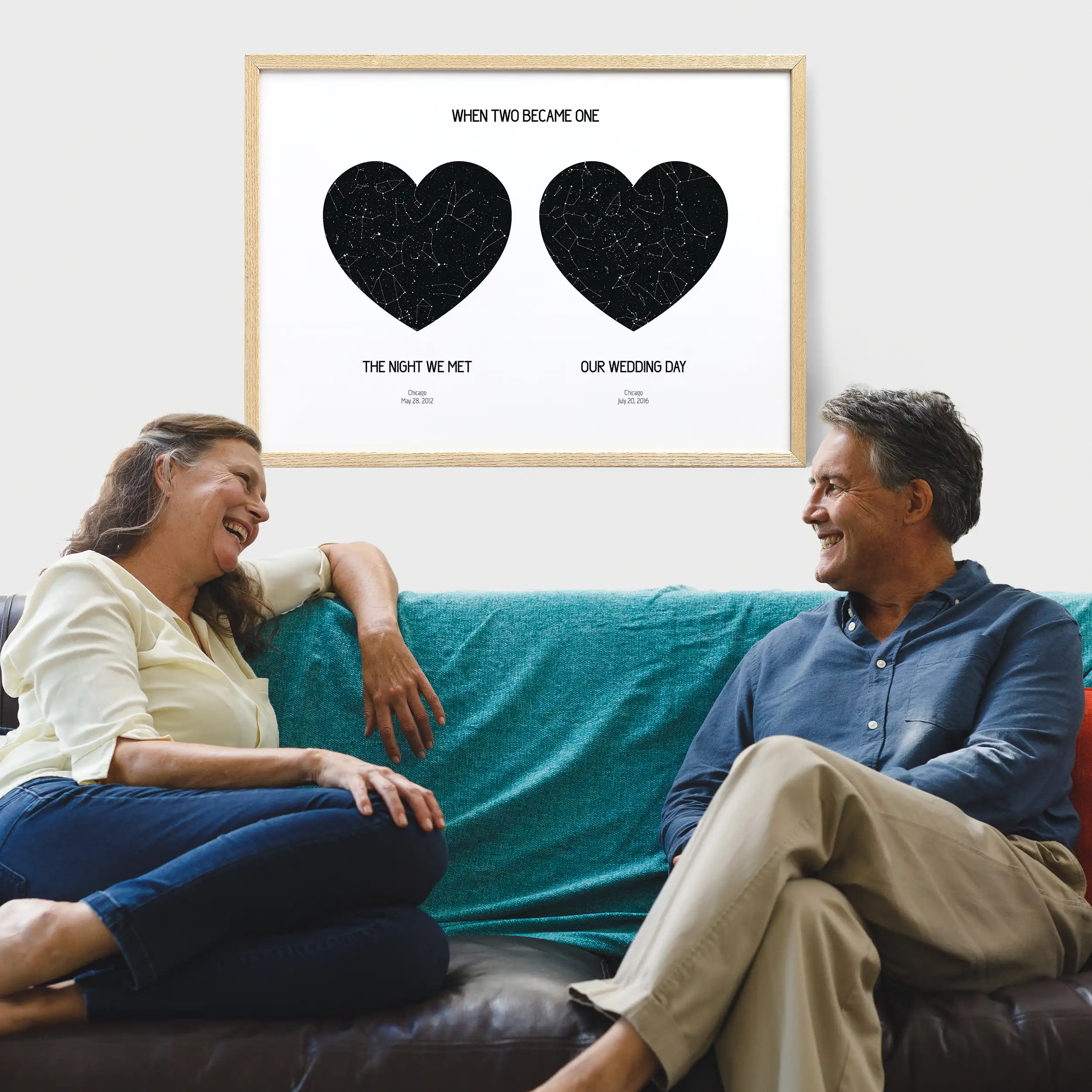 Die Doppelsternkarte „Als aus zwei Eins wurde“ ist ein wunderschöner und vollständig personalisierter Druck, perfekt für Jahrestag, Hochzeit, Valentinstag oder Weihnachten. Dieser exquisite Druck zeigt zwei Sternenkarten nebeneinander, die zwei Sternenhimmel von zwei verschiedenen Tagen darstellen, die für dich und deine Liebsten eine wichtige Bedeutung haben. Ob es der Tag eurer Verlobung, der Tag eurer Hochzeit oder ein anderer besonderer Anlass ist, dieses einzigartige Geschenk wird mit Sicherheit für viele Jahre wertvolle Erinnerungen und Emotionen wecken.