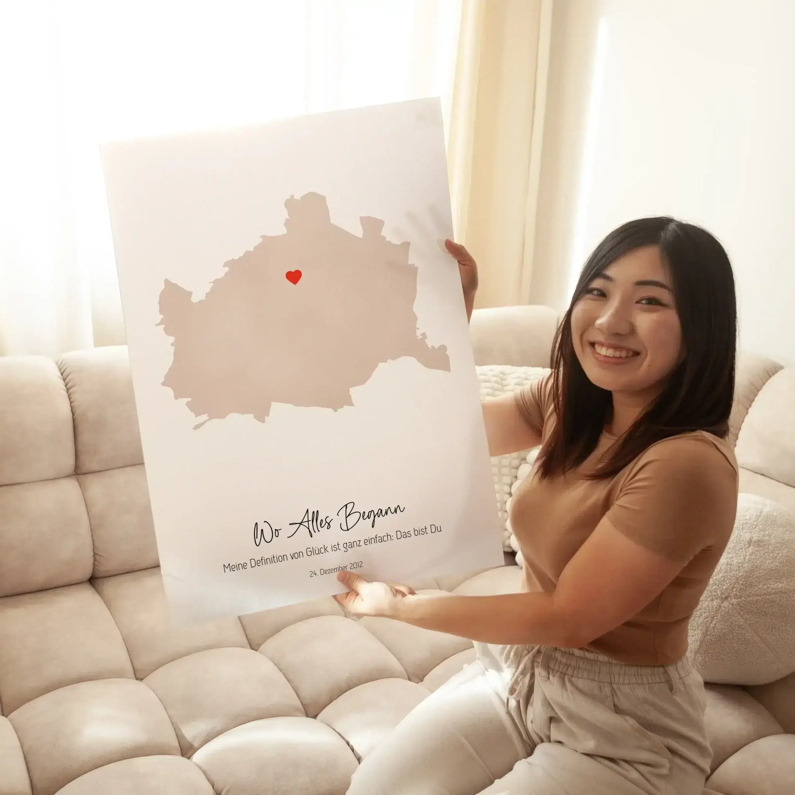Jeder Blick darauf wird zu einem Gesprächsstarter, einem emotionalen Auslöser und einer wertvollen Erinnerung daran, wo eure Reise begann. Mit Liebe gefertigt und für die Seele personalisiert, ist es ein Zeichen der Wertschätzung und dient als Zeugnis der Momente, die dein Leben geprägt haben. Kreiere noch heute dein Meisterwerk und feiere einfach „Wo alles begann“.