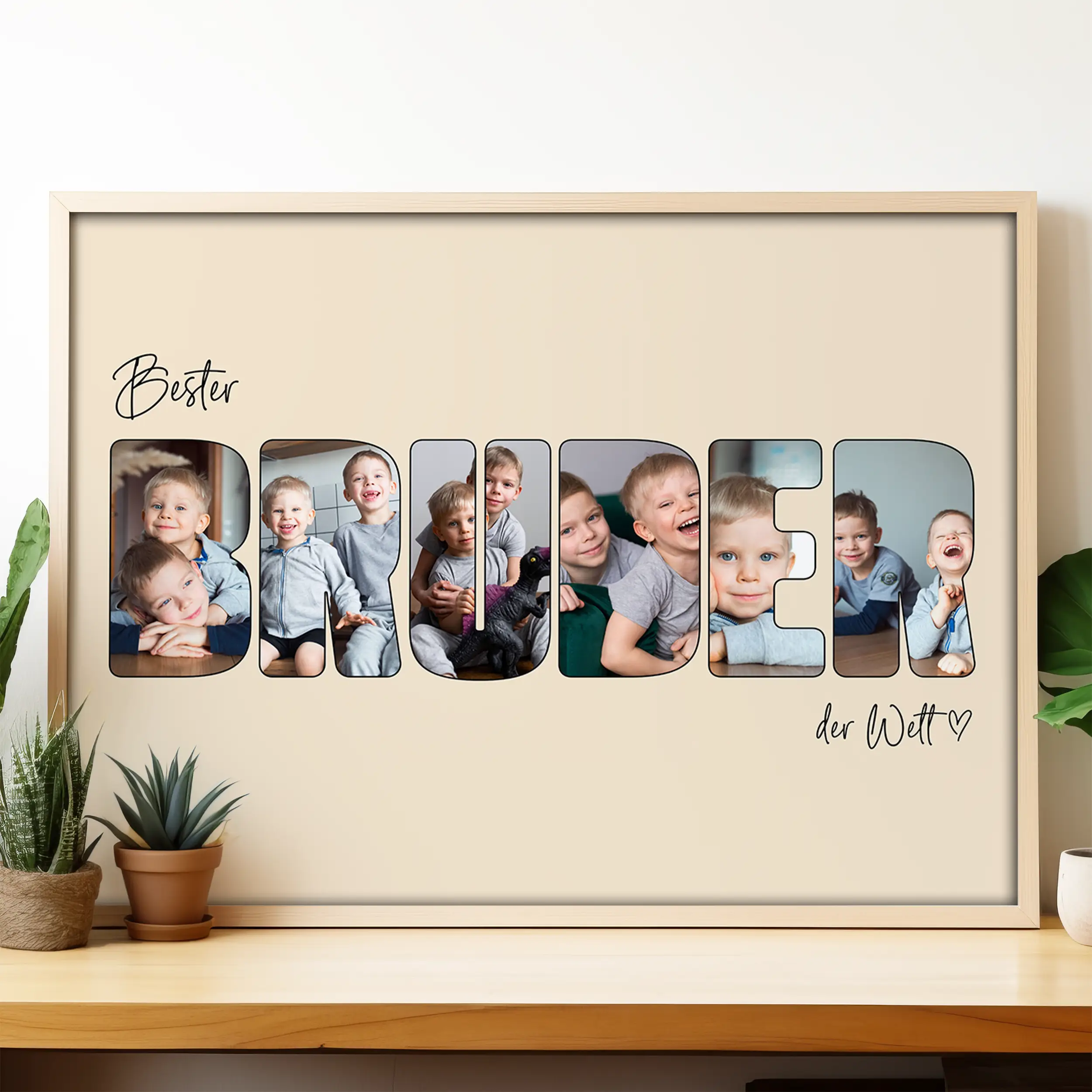 Eine Fotocollage mit einem Bruderbrief ist das perfekte personalisierte Geschenk für deinen Bruder, das eure wertvollsten gemeinsamen Momente zur Geltung bringt. Ob zum Geburtstag oder zu Weihnachten, eine Brief-Fotocollage für deinen Bruder ist eine kreative und einzigartige Möglichkeit, deine Liebe und Wertschätzung auszudrücken. Wähle ein personalisiertes Wort wie „Bruder“, „Bro“ oder „Amigo“ und gestalte jeden Buchstaben mit einem eigenen Foto. Mit endlosen Möglichkeiten kannst du ein ästhetisch ansprechendes und bedeutungsvolles Kunstwerk schaffen.