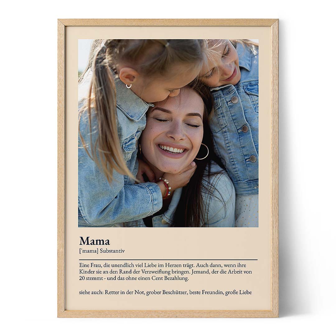 Dank unseres einfachen Online-Editors könnte die Erstellung dieses herzlichen Geschenks nicht einfacher sein. Zunächst wählst du ein Layout aus, das dir ins Auge fällt. Füge als Nächstes eine persönliche Note hinzu, indem du ein Foto hochlädst und das von dir gewählte Wort zusammen mit einer Definition eingibst. Du kannst sogar kreativ werden und deine eigene Definition finden, die die einzigartige Persönlichkeit und die Eigenarten deiner Mutter widerspiegelt. Wähle schließlich aus unserem Angebot an Optionen, darunter gerahmte Bilder, gedruckte Poster, Leinwanddrucke oder sofortige digitale Downloads.