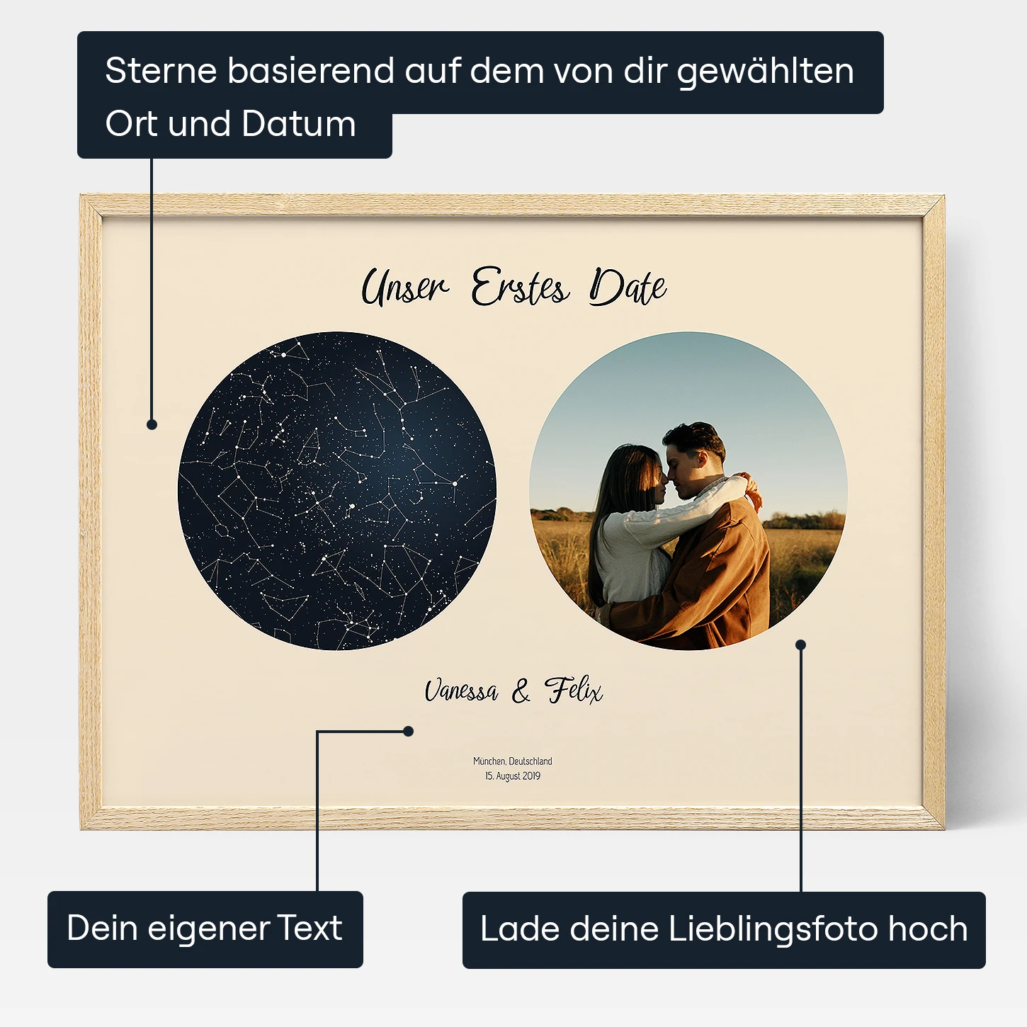 Wir bieten kostenlose Personalisierung für alle Bestellungen an, um sicherzustellen, dass jedes Kunstwerk individuell auf die Vorlieben unserer Kunden zugeschnitten ist. Unsere benutzerfreundliche Oberfläche ermöglicht es dir, mühelos dein eigenes personalisiertes Kunstwerk zu erstellen. Egal, ob du am Desktop oder auf einem mobilen Gerät bist, unsere Oberfläche ist darauf ausgelegt, ein nahtloses Erlebnis zu bieten.