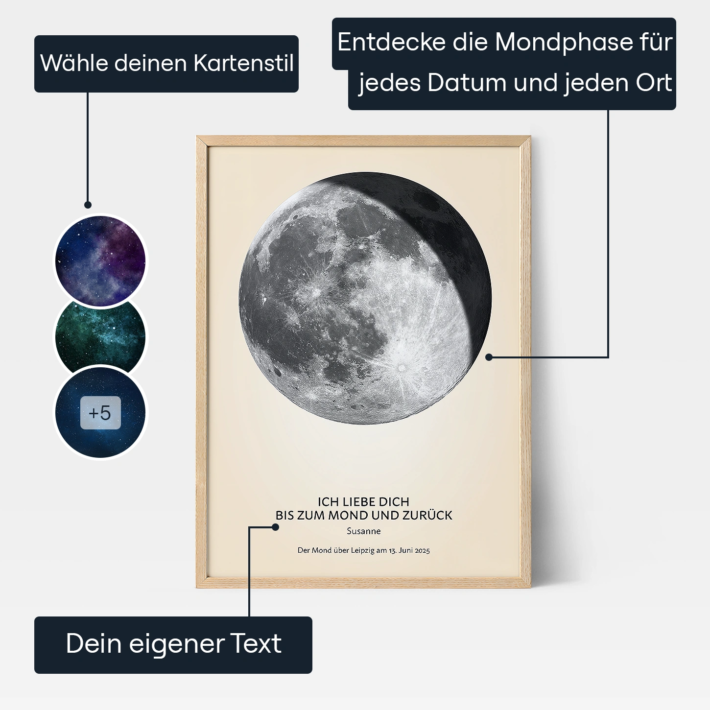 Halte einen besonderen Moment fest mit unserem Kunstwerk „Ich liebe dich bis zum Mond und zurück“, das die exakte Mondphase darstellt