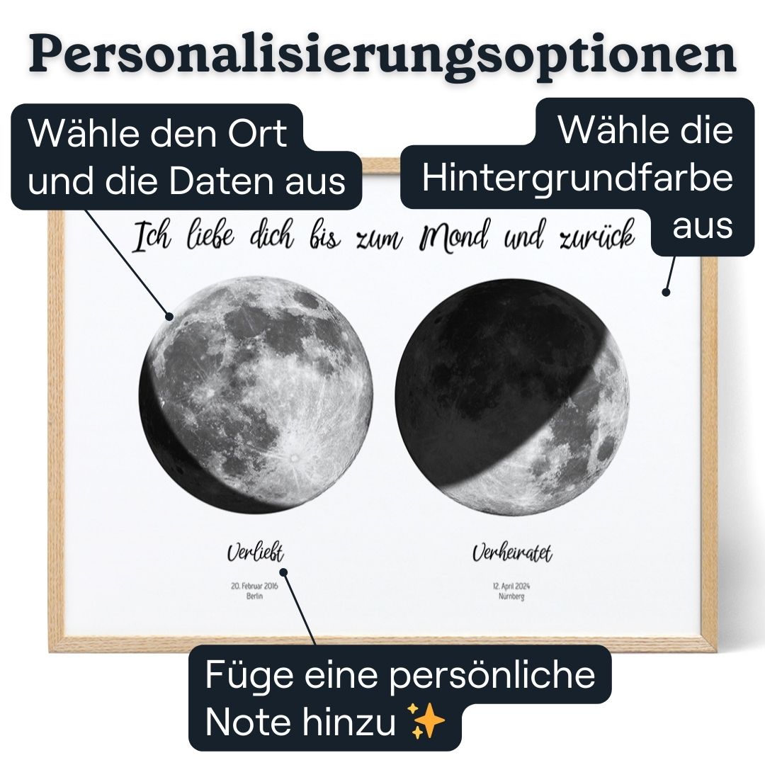 Bist du bereit, ein unvergessliches und herzliches Geschenk für deinen Seelenverwandten zu kreieren? Beginne noch heute mit der Personalisierung deines Seelenverwandte in Mondphasen-Kunstwerks.
