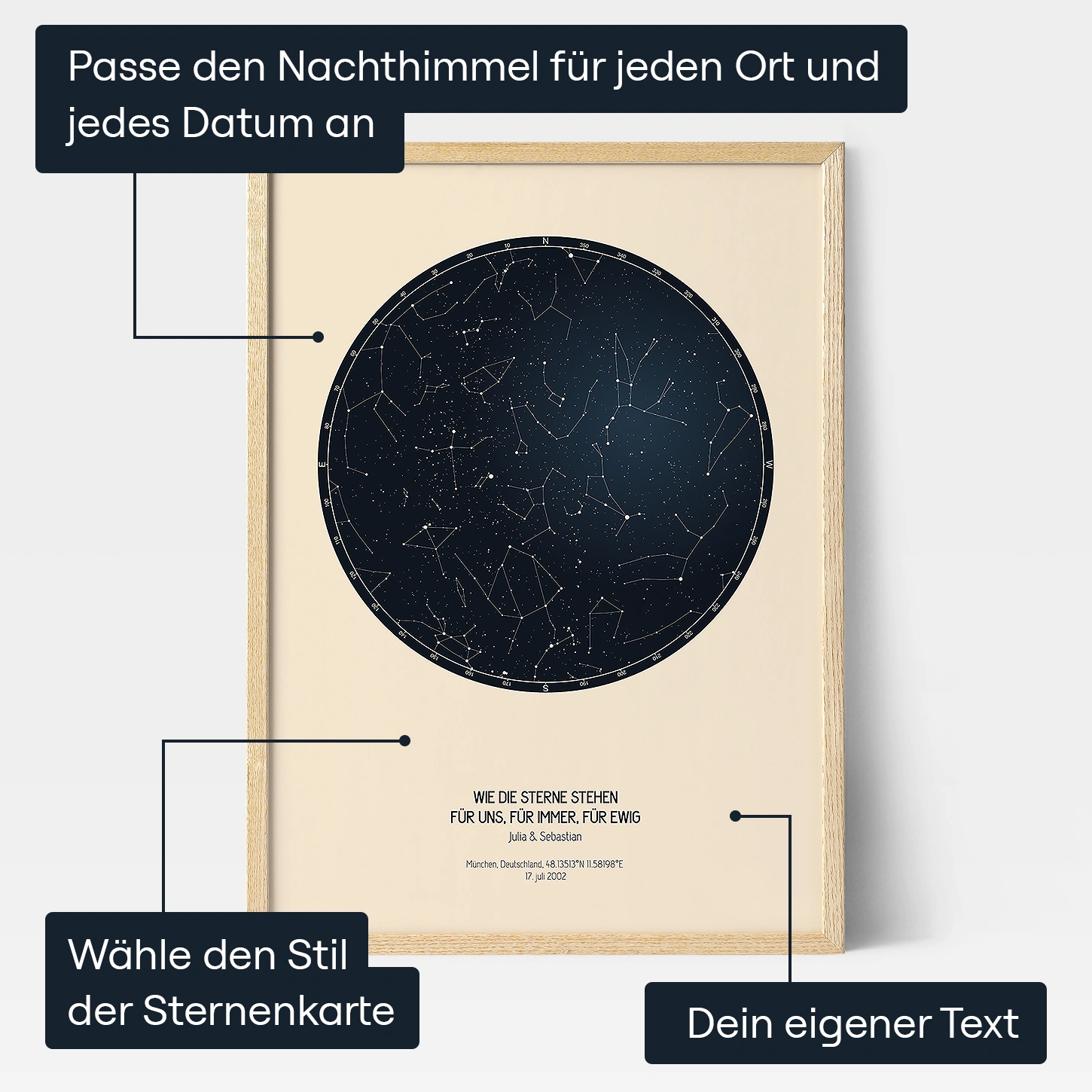 Der Sternenhimmel-Poster-Editor macht dein Geschenk persönlich! Mit dem Sternenkarten-Editor kannst du den Nachthimmel so auswählen, wie er an jedem Datum von überall auf der Welt angezeigt wird. Jede Karte kann durch zusätzliche Informationen zu Datum, Uhrzeit und Ort der Sternenkarte ergänzt werden. Du kannst sogar eine personalisierte Nachricht hinzufügen! Mit wenigen Klicks kannst du deinem Diagramm Beschreibungen hinzufügen, sowie Lieblingssterne, Planeten und Sternbilder.