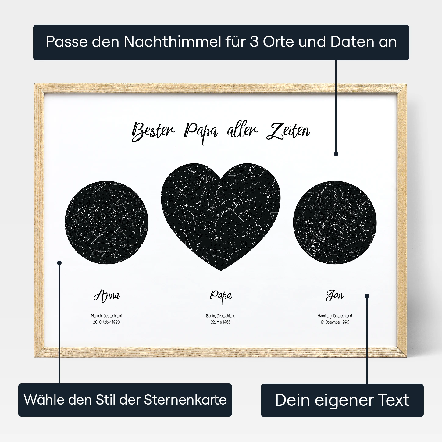 Mit drei wunderschönen Sternenkarten auf einem einzigen Poster ist dieses Geschenk vollständig anpassbar. Eine der Karten zeigt das Geburtsdatum und den Geburtsort deines Vaters, während die anderen beiden Karten dir und deinen Geschwistern gewidmet sind.
