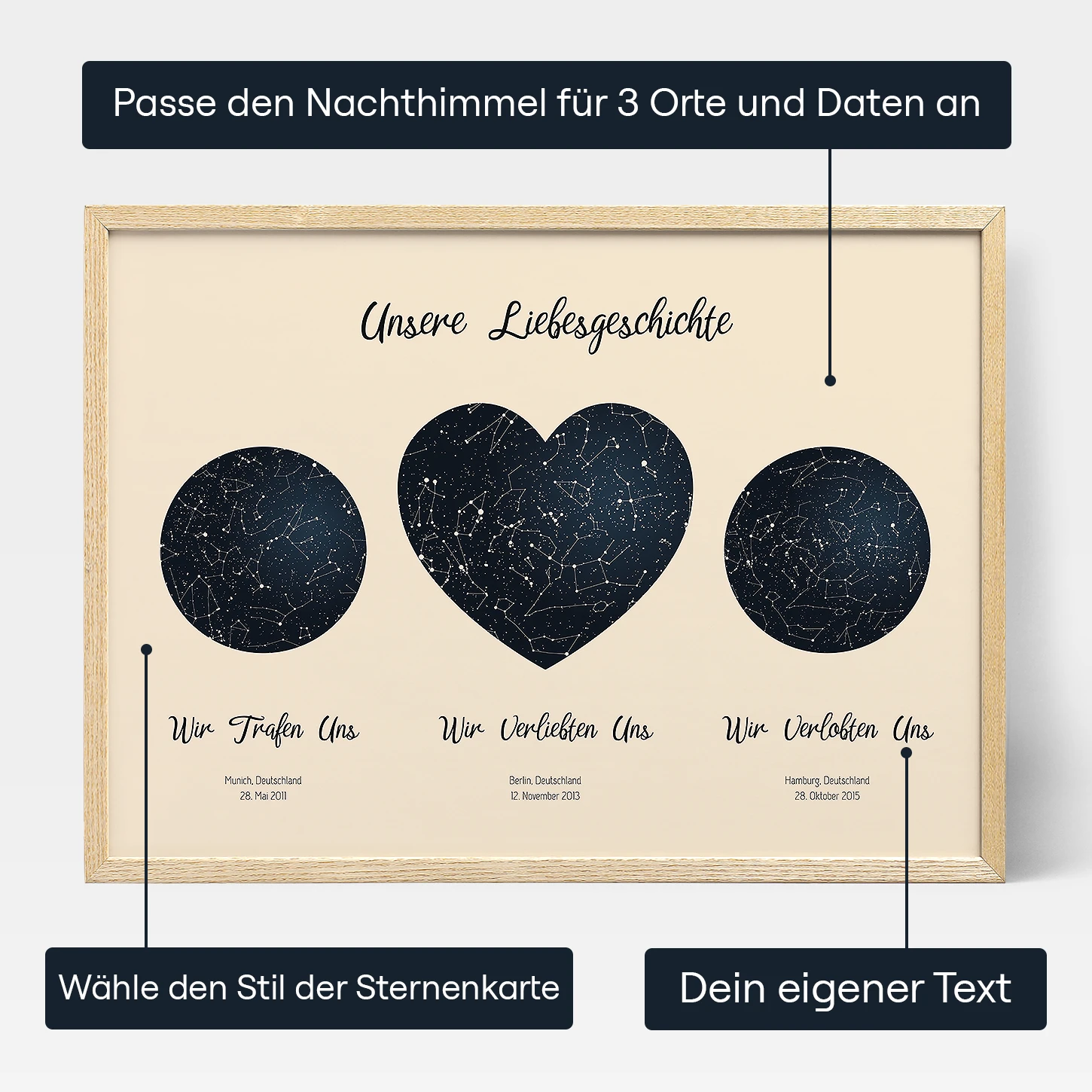 Suchst du nach einem einzigartigen und sentimentalen Geschenk für deinen Lebens-lieblingsmenschen - also deinen Lebensgefährten oder Lebensgefährtin? Suche nicht weiter als unsere dreifache Sternenkarte, die eure Liebesgeschichte darstellt. Dieser personalisierte Druck fängt drei besondere Momente in eurer Beziehung ein und ist somit das perfekte Geschenk für Jubiläen, Hochzeiten, Valentinstag, Weihnachten oder jede andere Feier.