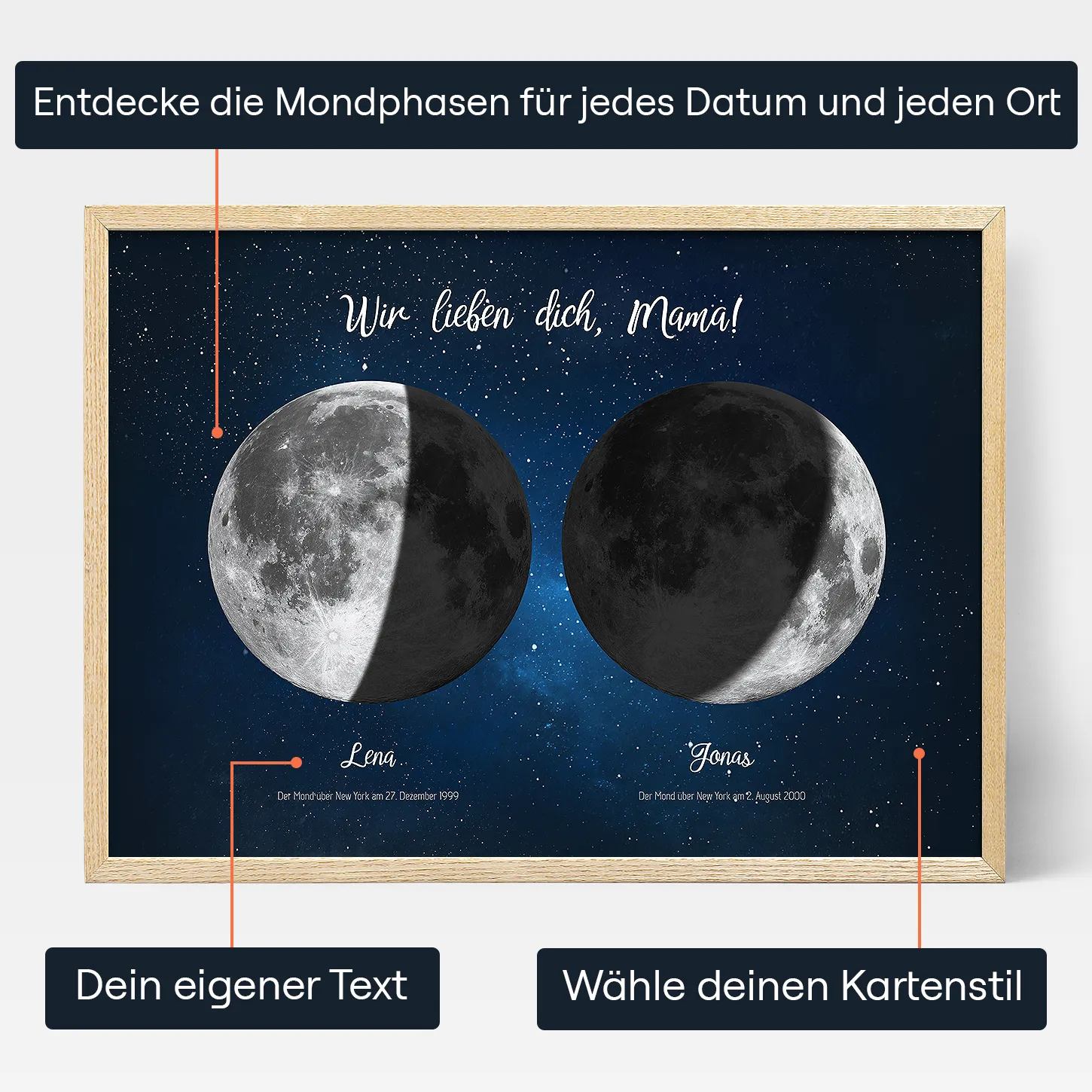 Suchst du nach einem besonderen Geschenk für Mama? Zwei Monde für Mama ist ein herzliches und einzigartiges Geschenk, das sie zum Lächeln bringen wird. Dieser personalisierte Druck oder diese Leinwand zeigt die Mondphasen von zwei wichtigen Daten, wie zum Beispiel den Geburtsdaten deiner Kinder. Es ist eine schöne Art, diese kostbaren Momente festzuhalten und sie an die besondere Bindung zu deinen Kindern zu erinnern.