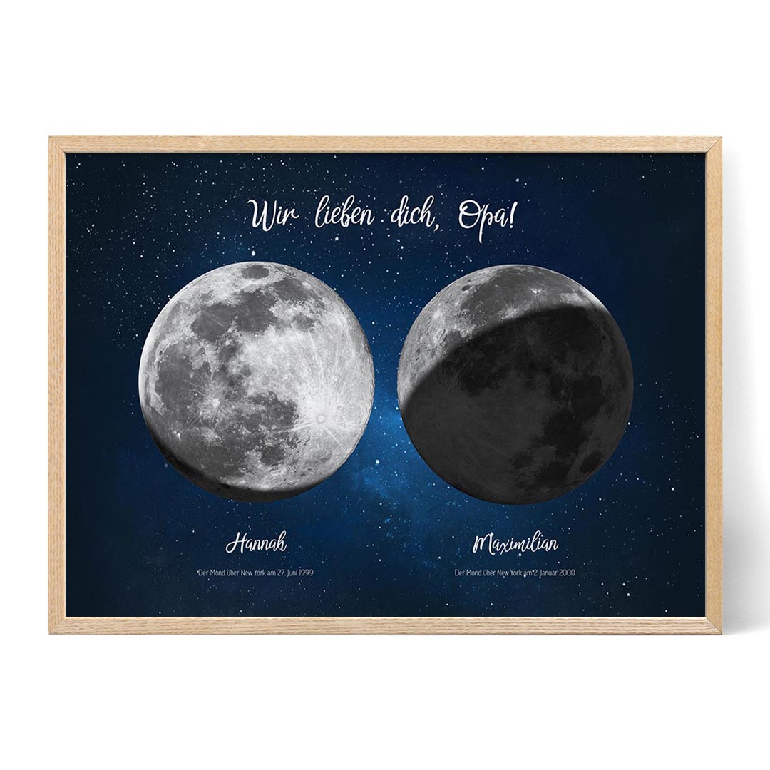 Suchst du nach einem besonderen Geschenk für Opa? „Zwei Monde für Opa“ ist ein einzigartiges und herzliches Geschenk, das sein Herz berühren wird. Dieser personalisierte Druck oder diese Leinwand zeigt die Mondphasen von zwei wichtigen Daten, wie zum Beispiel den Geburtsdaten seiner Enkelkinder. Es ist eine schöne Art, die geschätzten Momente, die ihm am Herzen liegen, zu feiern und zu ehren.