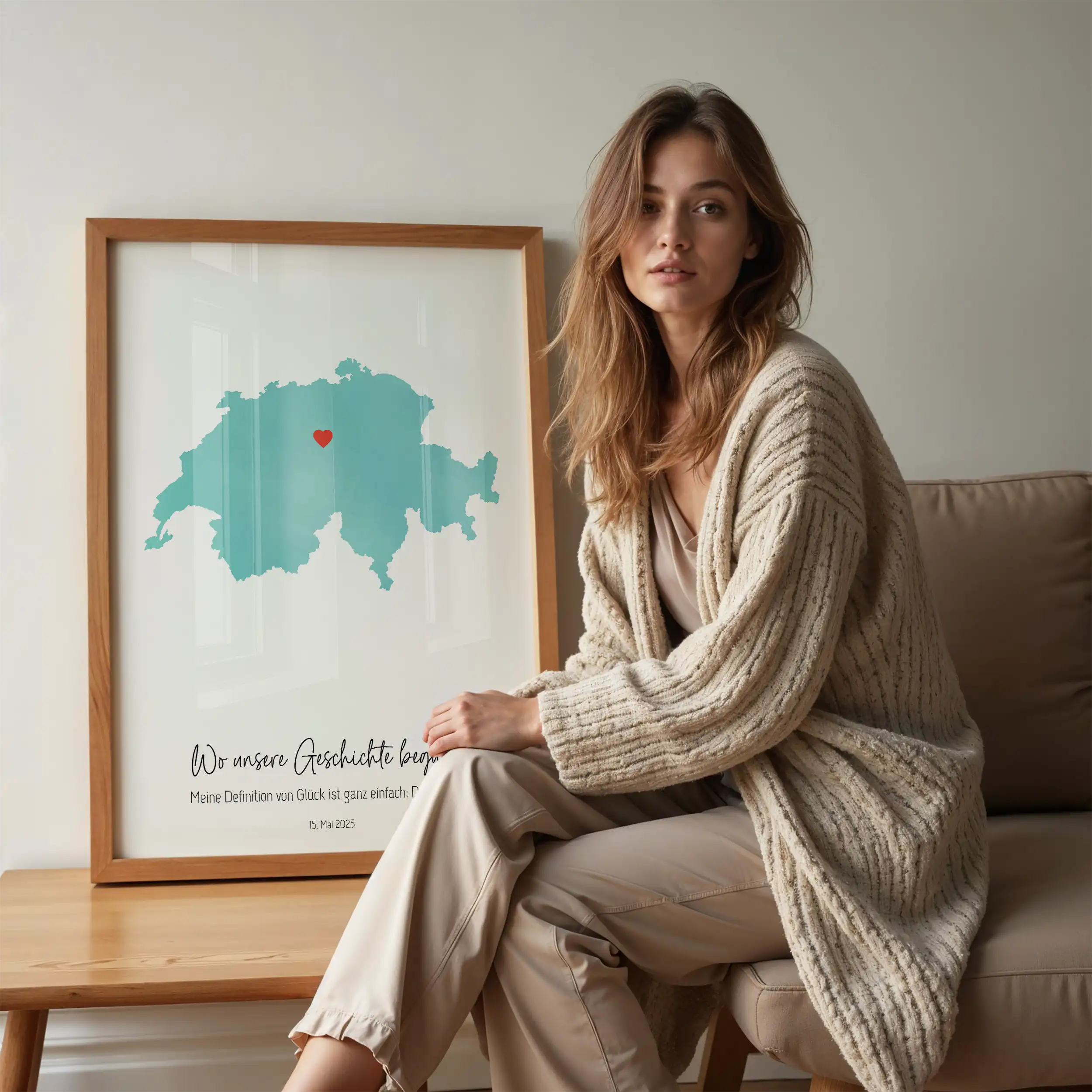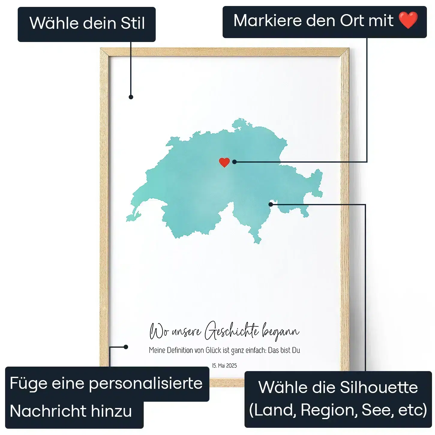Gestalte deine Karte als Nächstes noch persönlicher, indem du eine herzförmige Markierung hinzufügst, um genau die Stelle zu markieren, an der sich der unvergesslicher Moment ereignet hat – den Ort, an dem ihr euch kennengelernt, verlobt oder den Bund fürs Leben geschlossen habt. Füge abschließend eine herzliche Nachricht oder ein Zitat unter der Karte hinzu, das das Herz des Empfängers sicherlich zum Schmelzen bringen wird. Der letzte Schliff ist die Auswahl deines bevorzugten Formats: gerahmtes, gedrucktes Poster, Leinwand oder eine digitale Datei./p>