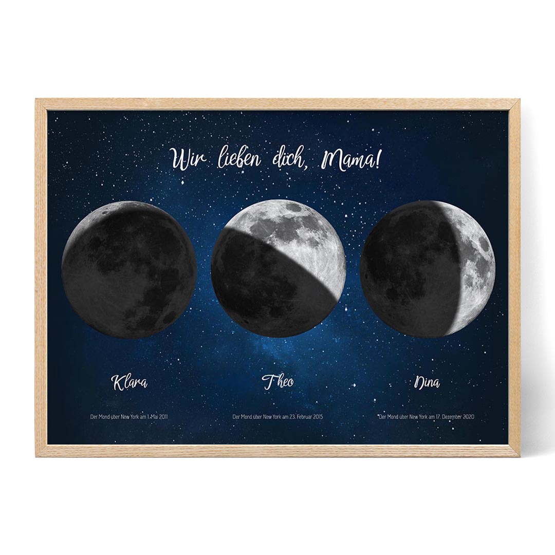 Bist du bereit, ein unvergessliches und herzliches Geschenk für Mama zu kreieren? Beginne noch heute mit der Personalisierung deines Three Moons for Mom-Kunstwerks.