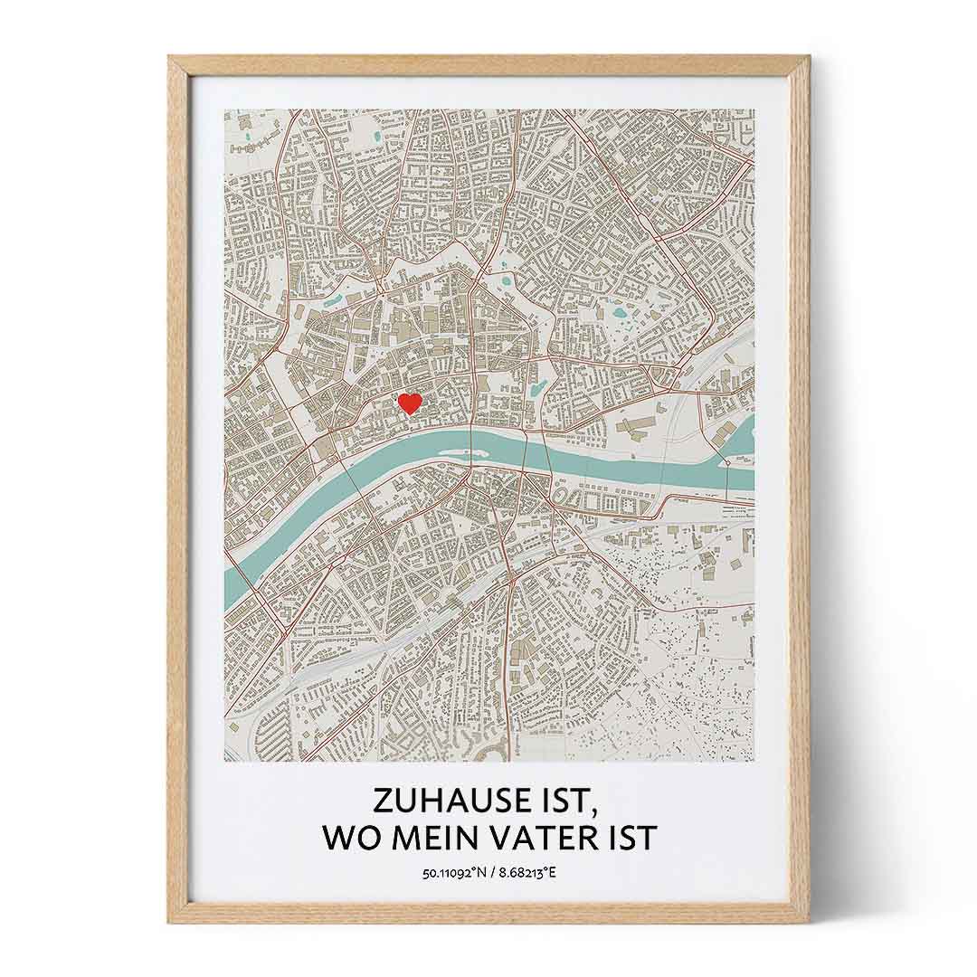 Dieses schöne Kartenkunstwerk zeigt einen Ort deiner Wahl mit allen Details, die du auf einer Karte finden möchtest. Lasse eine Stecknadel an dem Ort fallen, an dem dein Zuhause ist, um deinem Vater zu zeigen, dass sie dir immer am Herzen liegt. Unsere Karten sind das perfekte Vatertagsgeschenk und können vollständig angepasst werden, damit diese besonders sind.