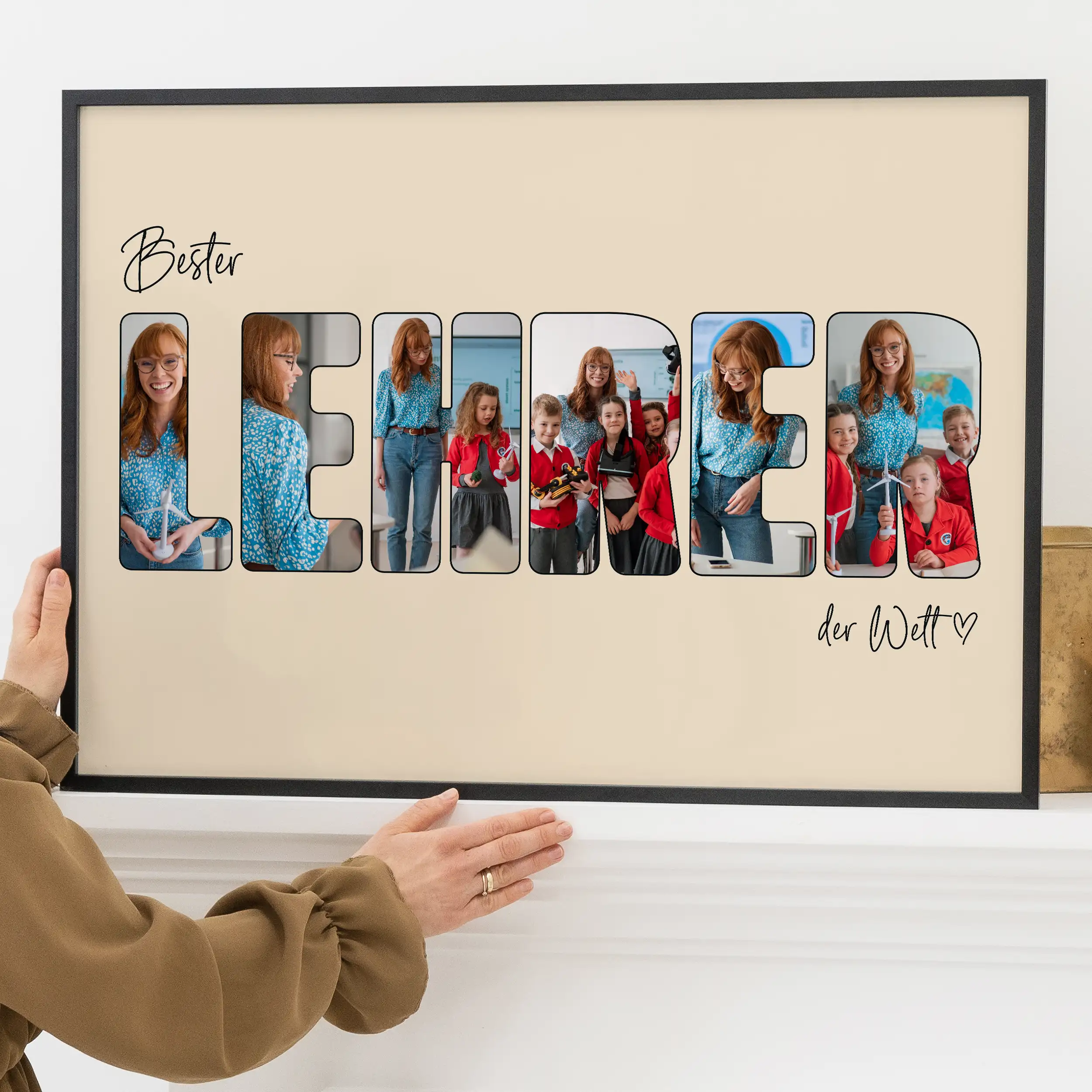 Suchst du nach einem einzigartigen und durchdachten Geschenk für deinen Lehrer, um deine Wertschätzung zu zeigen? Wir schlagen unsere  Lehrer-Buchstaben-Fotocollage vor. Diese personalisierte und kreative Collage präsentiert wertvolle Fotos und Kunstwerke in Form von Buchstaben. Wähle deine eigenen Fotos und Worte aus, um ein einzigartiges Erinnerungsstück zu schaffen, das noch viele Jahre in Erinnerung bleiben wird.