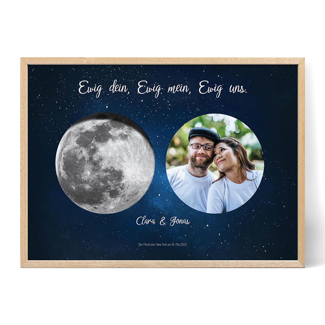 Suchst du nach einem einzigartigen und unvergesslichen Geschenk, das himmlische Schönheit mit persönlichen Erinnerungen verbindet? Mondphase mit Foto ist ein personalisierter Druck oder eine Leinwand, die das Wunder der Mondphasen wunderschön mit deinem geliebten Foto verbindet. Dieses exquisite Kunstwerk zeigt eine Mondphase von einem bedeutenden Datum in deinem Leben neben einem wertvollen Foto. Es ist die perfekte Möglichkeit, besondere Momente zu feiern und ein bleibendes Andenken zu schaffen.