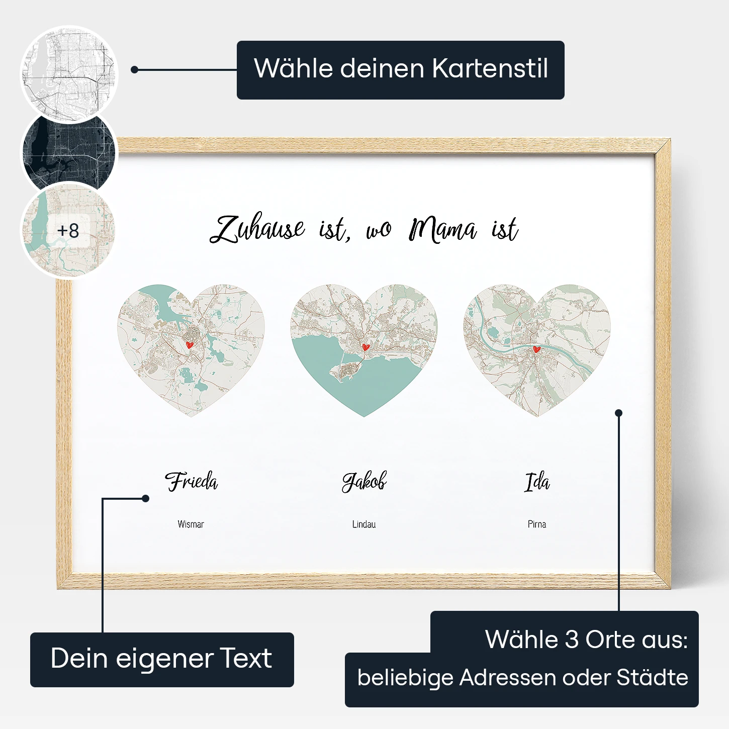 Positive Prints beseitigt das Rätselraten beim Entwerfen benutzerdefinierter Kartengrafiken. Mit unserem interaktiven Editor kannst du die Form, den Stil, die Farben und den Text auf deiner „Long Distance Mom Map“ auswählen. Beobachte, wie dein Design zum Leben erwacht, während du deinen Druck anpasst, um deine Geschichte zu erzählen.