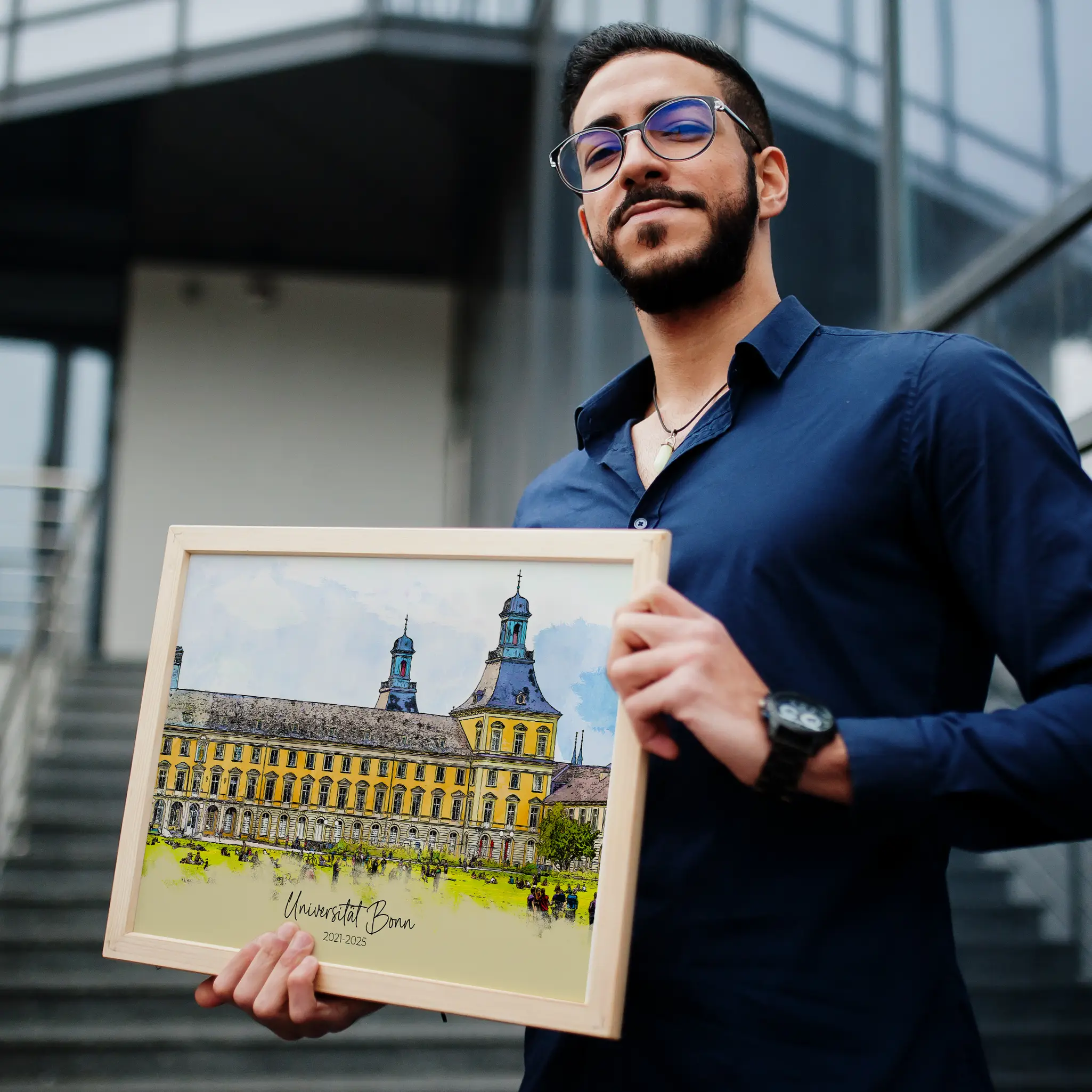 Verwandele ein Foto deiner Universität in ein einzigartiges digitales Aquarellporträt. Das perfekte personalisierte Geschenk für Alumni, Studenten oder Professoren!