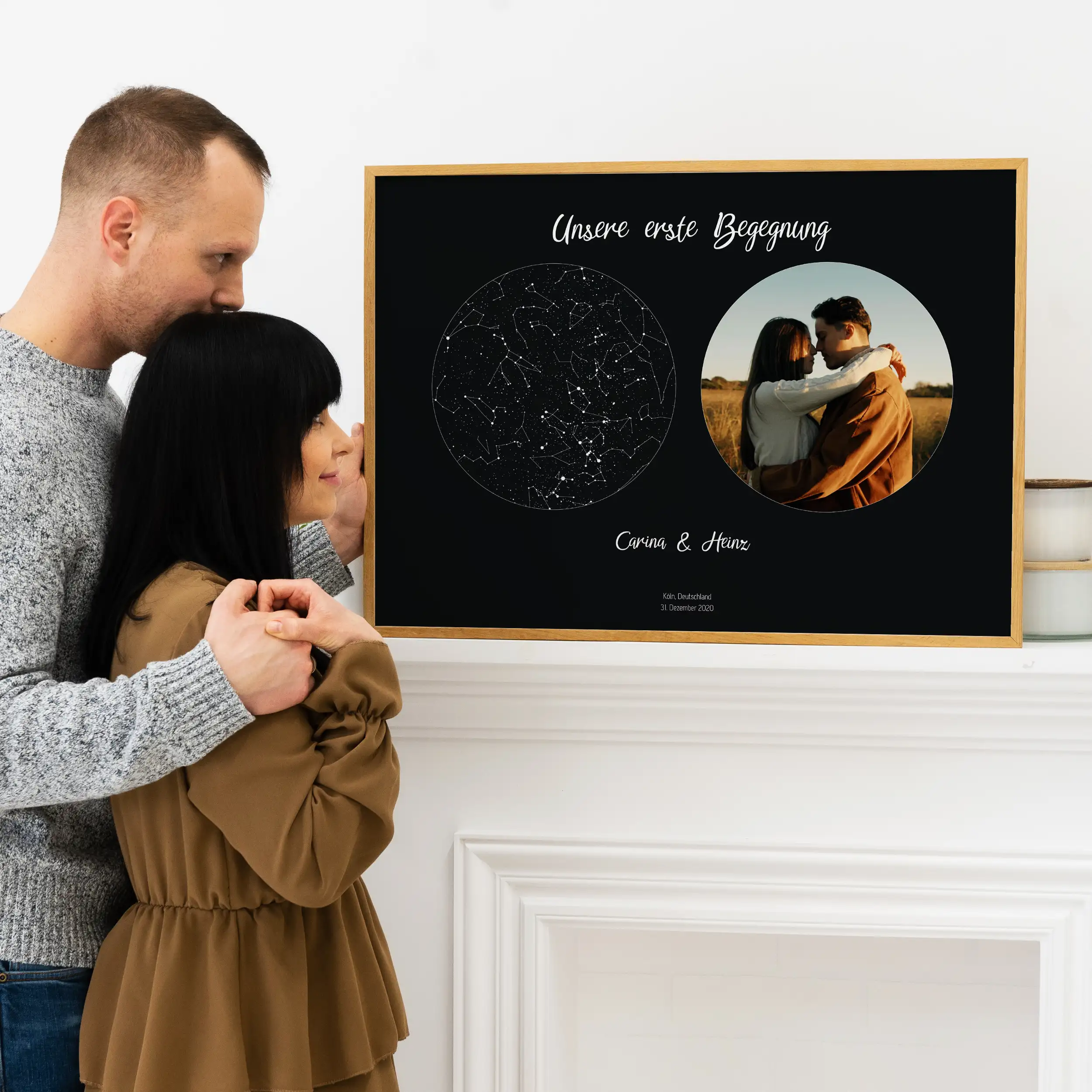 „Sterne in der Nacht, in der wir uns trafen“ zeigt eine Liebesgeschichte. Es ist ein Beweis eurer Liebe und der Erinnerungen, die euch einander nähergebracht haben. Jeder Blick auf diese Kombination aus Sternenkarte und Foto weckt die Gefühle dieser magischen Nacht und macht sie zu einer bleibenden Erinnerung an eure Liebesgeschichte. Mache dein romantisches Geschenk mit diesem personalisierten Meisterwerk unvergesslich.