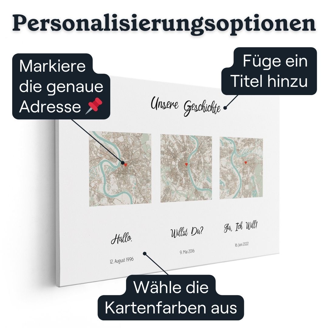 Suchst du nach einem einzigartigen und bedeutungsvollen Hochzeitsgeschenk? Unsere Karte „Verliebt Verlobt Verheiratet“ als Leinwandbild ist die perfekte Wahl. Diese personalisierte Leinwand zeigt drei Karten, die jeweils einen wichtigen Meilenstein in der Beziehung des Paares hervorheben: wo sie sich kennengelernt, verlobt und geheiratet haben.