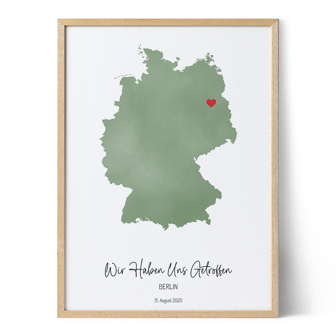 Erweitere dein Geschenkspiel mit unserer Aquarell-Karte „Wo wir uns trafen“. Du hast die kreative Freiheit, eine Karte zu entwerfen, die zu deiner persönlichen Reise passt. Beginne mit der Auswahl aus unseren atemberaubenden Aquarellstilen oder gestalte dein einzigartiges Farbschema ganz nach deinem Geschmack. Wähle als Nächstes das Land, den Staat oder die Stadt aus, in dem sich eure Wege zum ersten Mal gekreuzt haben und markiere es mit einer herzförmigen Stecknadel.