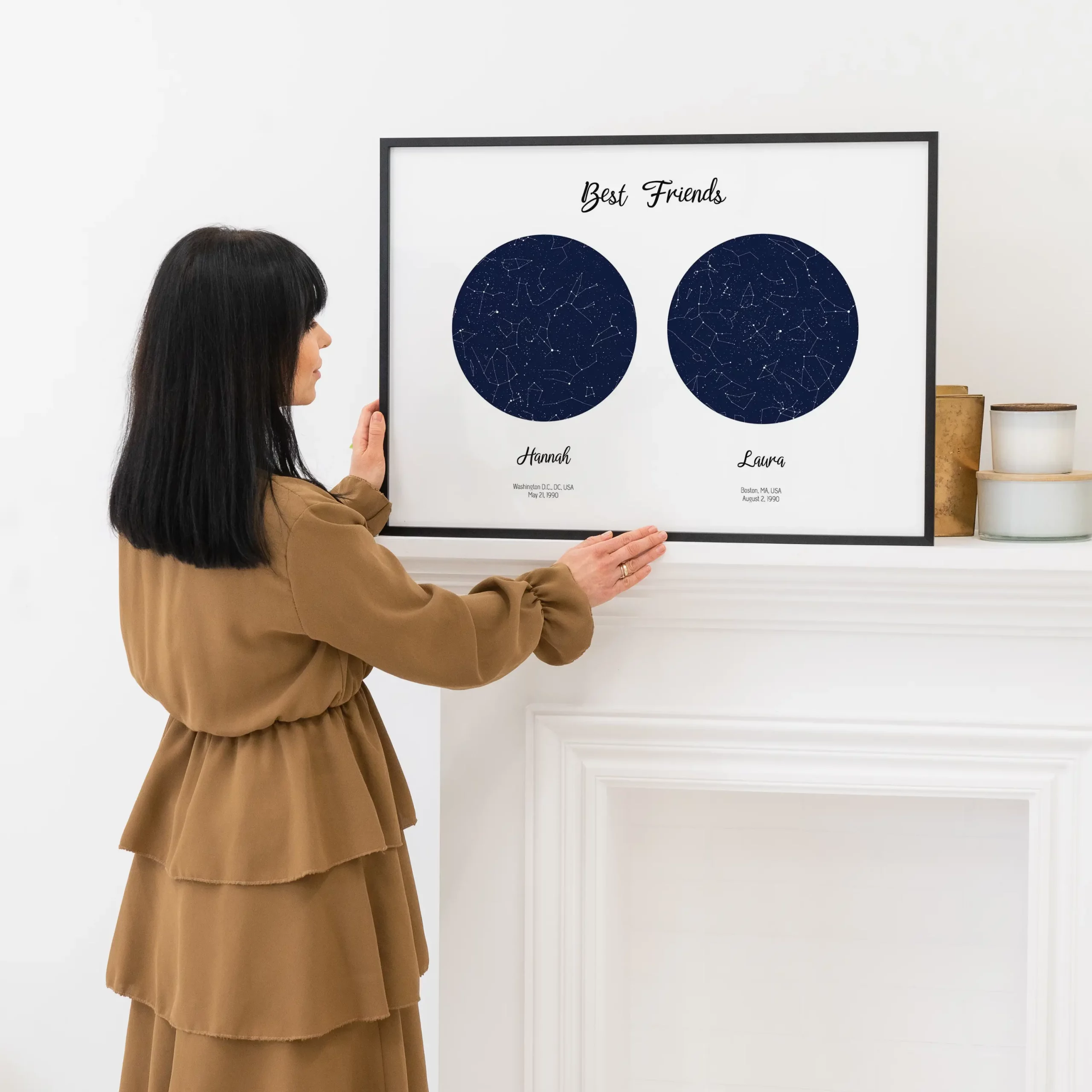 Dank unseres Online-Kreators ist es ganz einfach, deine ganz eigene „Bester Freund“-Doppelsternkarte zu erstellen. Wähle den Stil, das Design und die Farben, die den Geschmack und die Persönlichkeit deines Freundes am besten widerspiegeln. Du kannst das Kunstwerk sogar mit den Lieblingsfarben deines Freundes personalisieren. Gebe die Daten und Orte ein, die für dich und deinen Freund von Bedeutung sind und sehe, wie die Sternenkarten den Nachthimmel zu diesen beiden besonderen Anlässen darstellen. Jede von dir vorgenommene Änderung wird sofort in der Online-Vorschau sichtbar, sodass du sicherstellen kannst, dass alles genau so ist, wie du es möchtest. Wähle abschließend das Format und die Größe, die am besten zum Stil deines Freundes passen, egal ob du ein gedrucktes oder gerahmtes Poster, eine Leinwand oder einen sofortigen digitalen Download wählst.