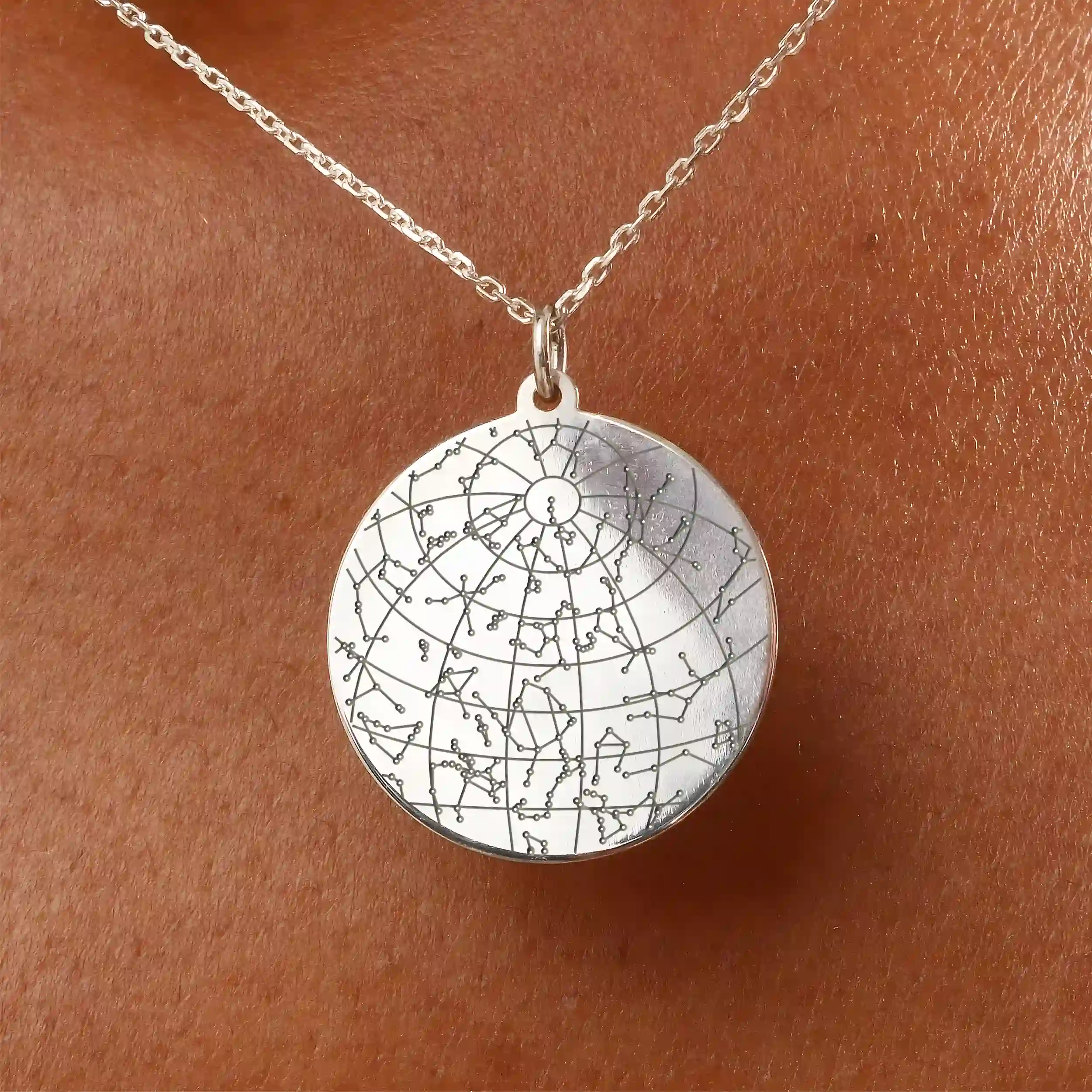 Jeder Anhänger, ob kreisförmig oder mit 45 cm langer Kette, wird einer Lasergravur unterzogen, um den Nachthimmel in ein tragbares Kunstwerk zu verwandeln. Eine kleine Markierung am Anhänger und an der Kette sorgt für echte und gute Qualität.
