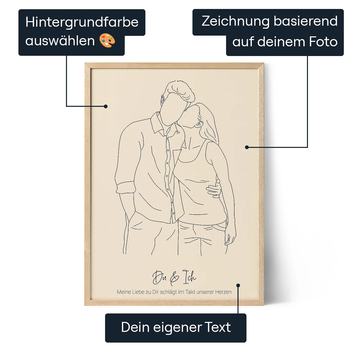 - Lasse ie unsere Künstler einzigartige Strichzeichnungen aus deinem Foto zeichnen, damit du es mit deinen Lieblingsmenschen auf der Welt teilen kannst