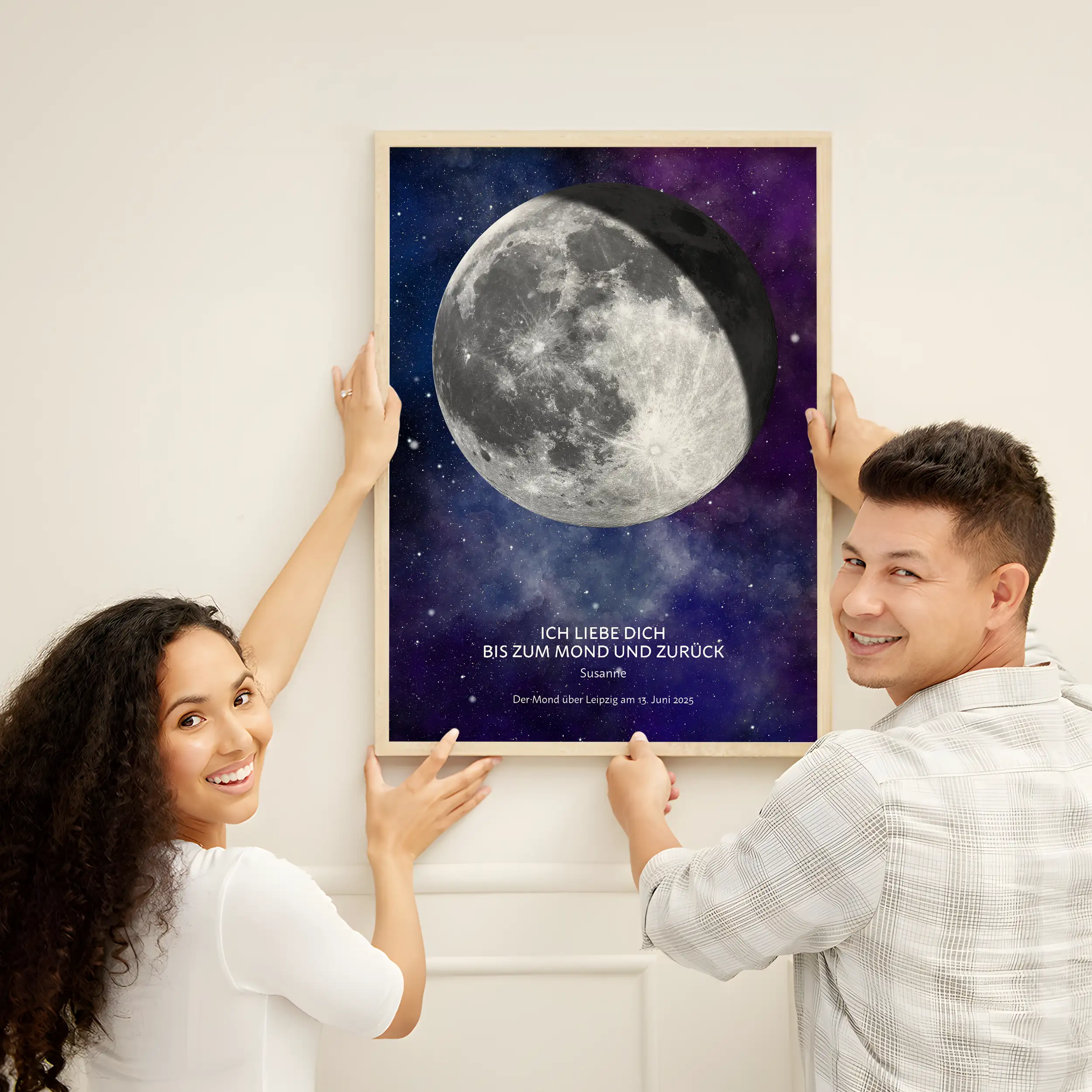 Halte einen besonderen Moment fest mit unserem Kunstwerk „Ich liebe dich bis zum Mond und zurück“, das die exakte Mondphase darstellt