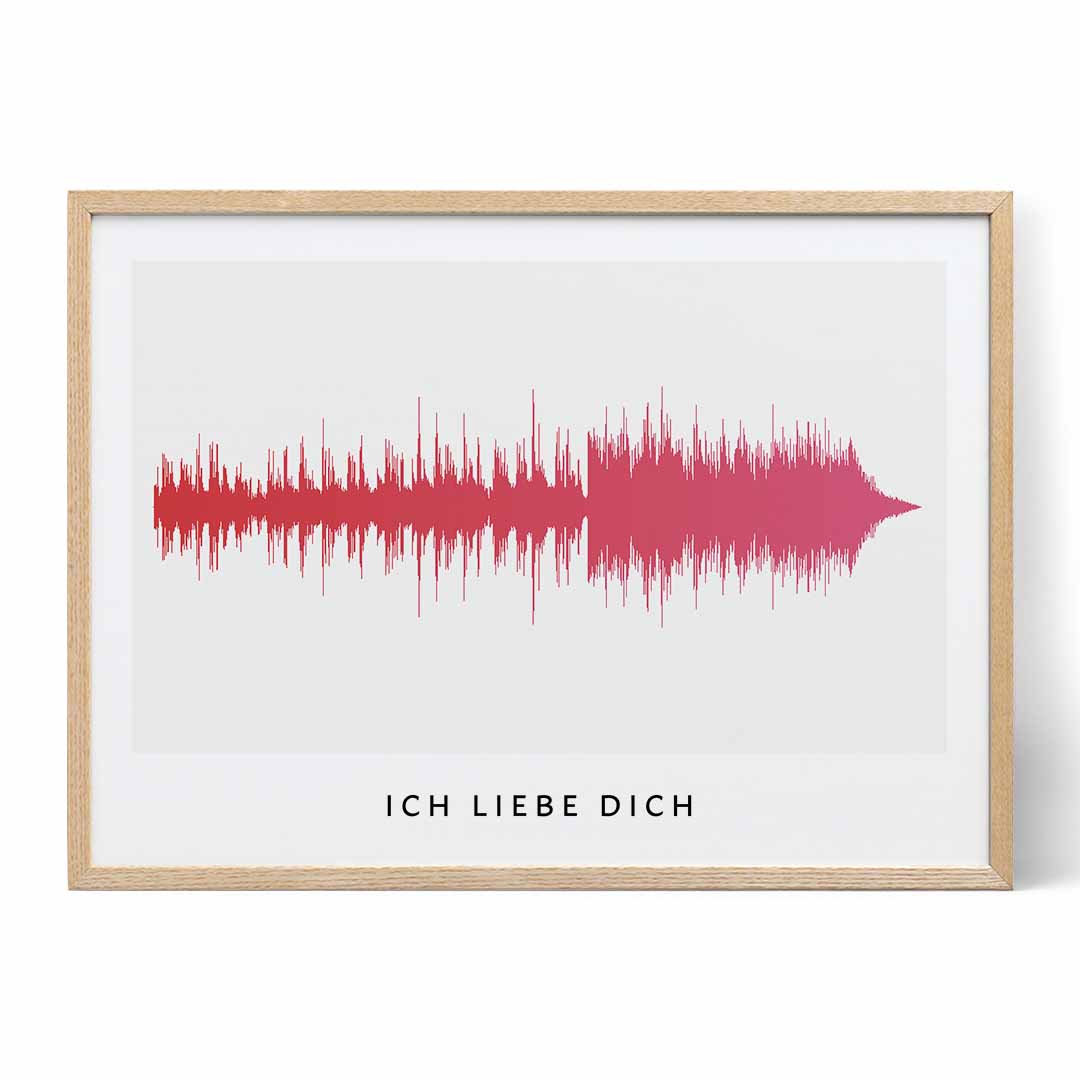 Wir nehmen deine Audiodatei und verwandeln deinen Sound in eine visuelle Welle. Jede Klangwellenkunst ist einzigartig, da keine zwei Stimmen ganz gleich sind. Lade einfach eine Audiodatei hoch, in der dein geliebter Mensch „Ich liebe dich“ sagt und wir verwandeln diese in ein Kunstwerk.