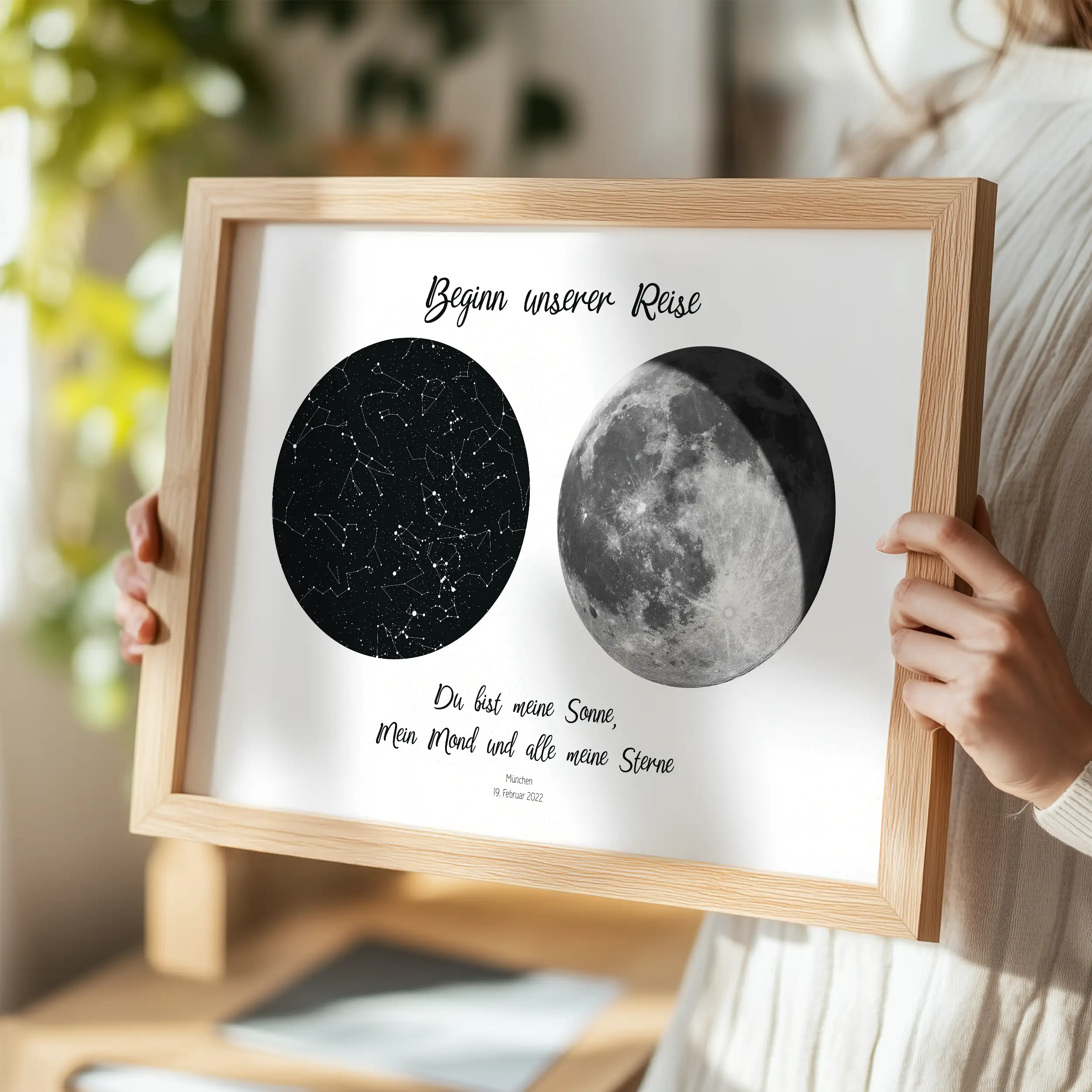 Feiere einen besonderen Moment mit einem romantischen Geschenk, das die Schönheit der Mondphase und der Sterne an einem bestimmten Tag einfängt. Ob ein Jahrestag, Hochzeit oder ein anderer bedeutsamer Anlass – dieser individuelle Druck zeigt die genaue Mondphase und den Sternenhimmel dieser unvergesslichen Nacht