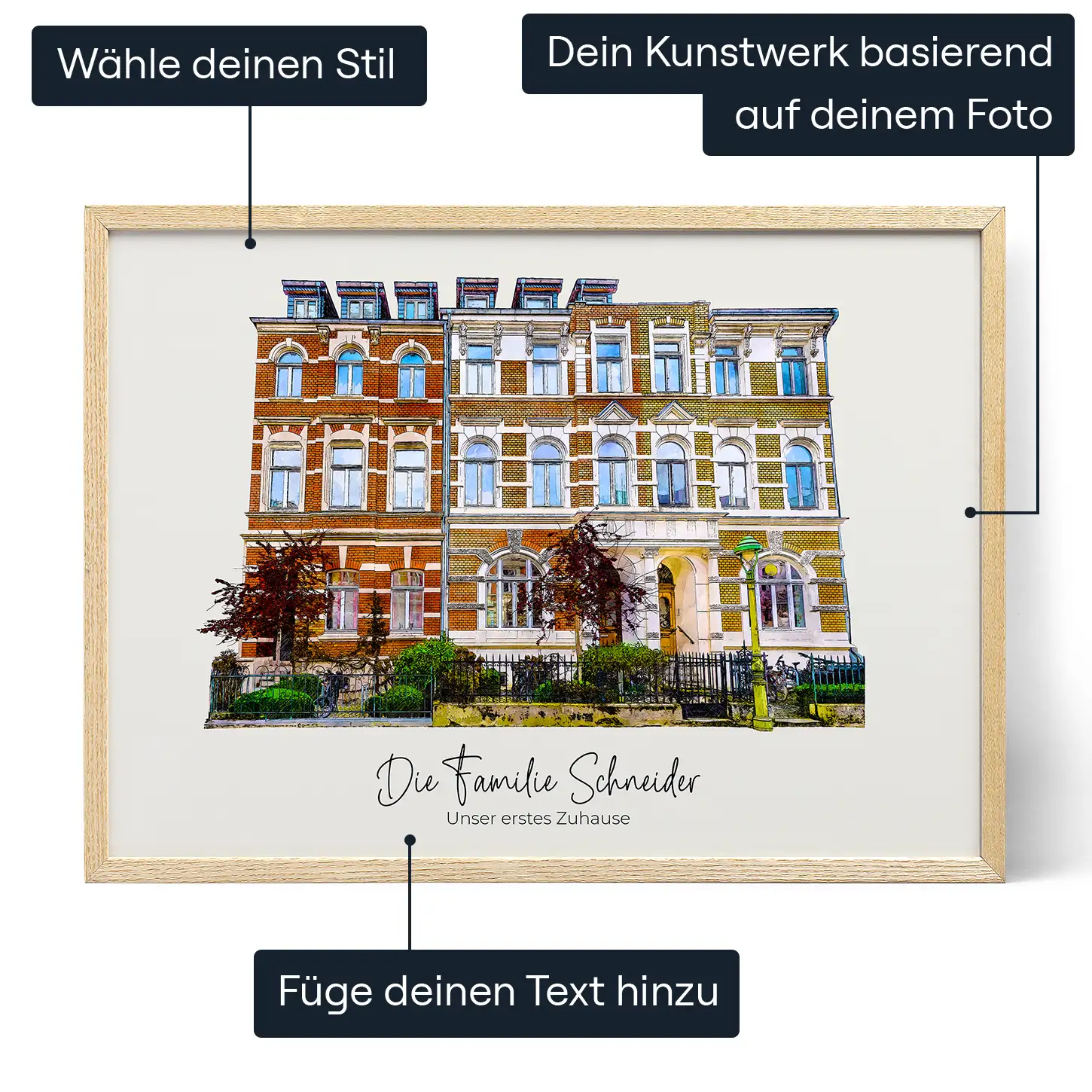 Verwandele das Foto eures Zuhauses in ein personalisiertes digitales Porträt, komplett mit individuellem Text und schaffe so das perfekte Andenken an einen Meilenstein, egal ob es euer erstes Haus oder euer Zuhause für immer ist.