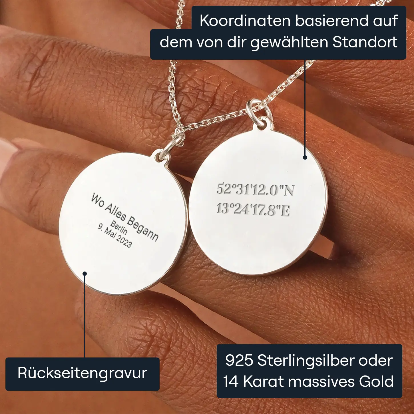 Jeder Anhänger, ob stilvoller Kreis oder mit 45 cm langer Kette, wird einer sorgfältigen Lasergravur unterzogen, um Präzision und Haltbarkeit zu gewährleisten. So stellst du sicher, dass dein einzigartiges Schmuckstück die Zeit überdauert, genau wie deine geschätzten Erinnerungen.