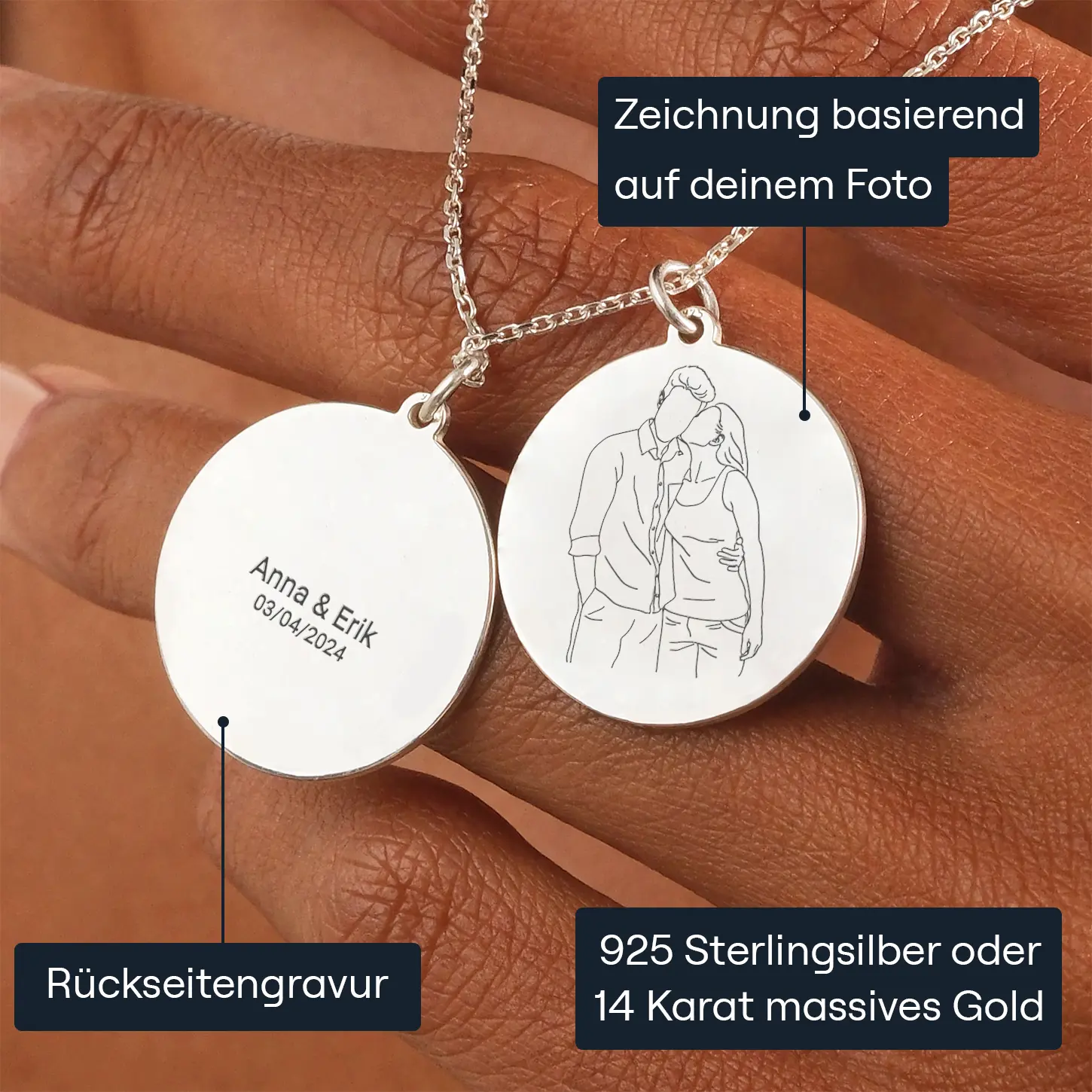 Jeder Anhänger, egal, ob es sich um einen eleganten Kreis oder eine 45-cm-Kette handelt, wird einer sorgfältigen Lasergravur unterzogen, um makellose Details und Haltbarkeit zu gewährleisten. Das bedeutet, dass dein personalisiertes Schmuckstück eine bleibende Hommage an deine schönsten Momente sein wird.