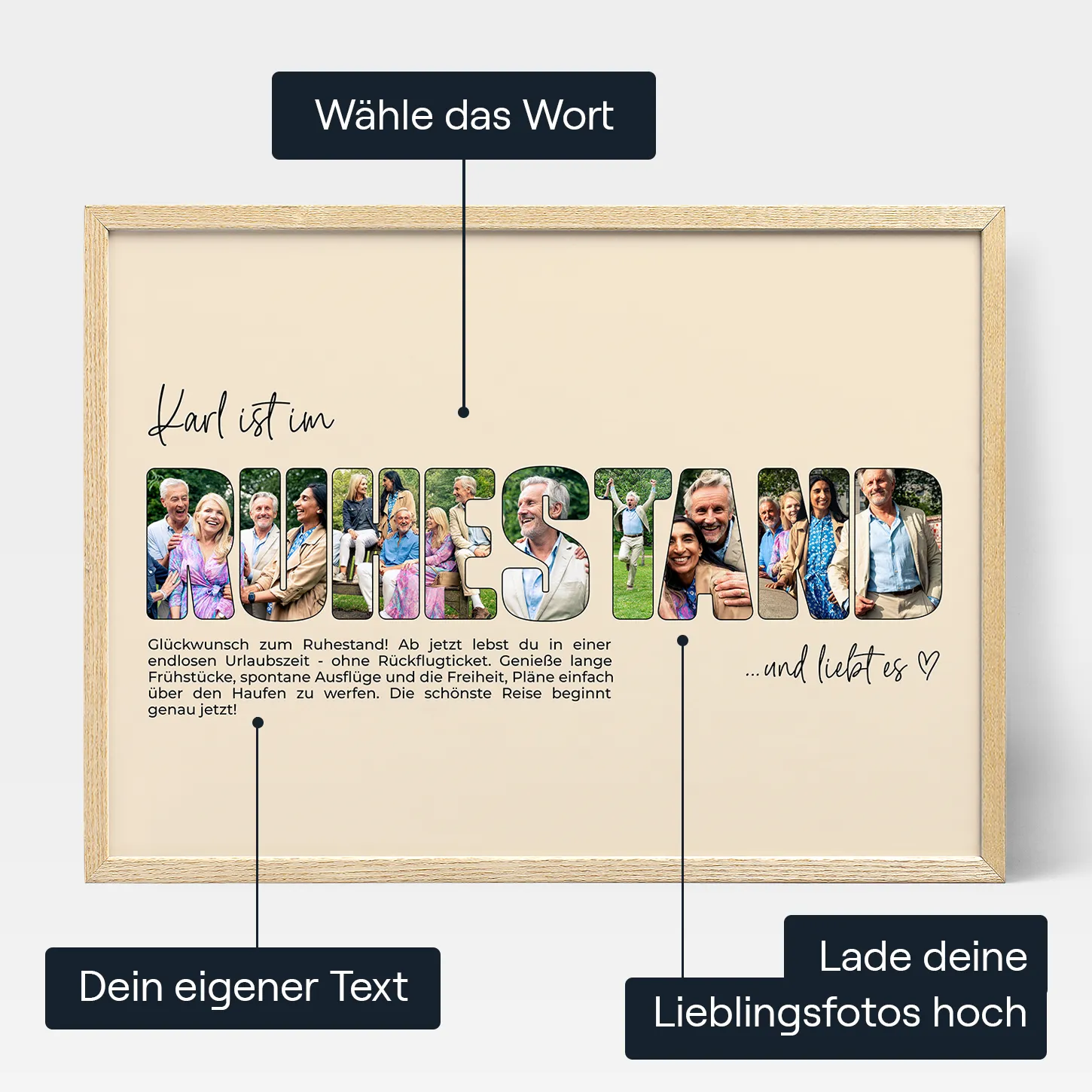 Eine personalisierte Fotocollage zur Feier des wohlverdienten Ruhestands – voller Erinnerungen, die die Reise zu etwas Besonderem machten