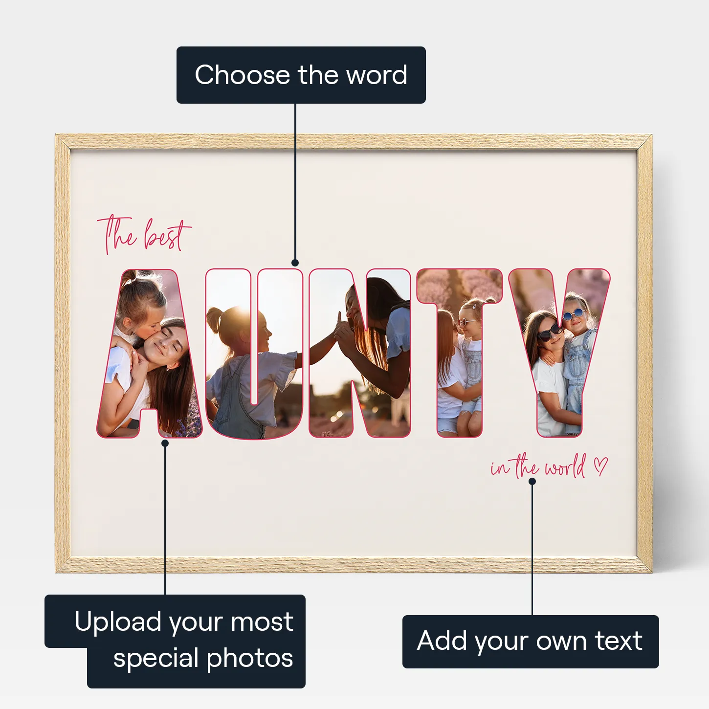 Create a unique Aunt Letter Photo Collage as a heartfelt gift. Craft a custom message with your choice of word or your aunt's name, add photos, and select outline colors. Express your love with a one-of-a-kind print for Christmas, birthdays, or any special occasion.