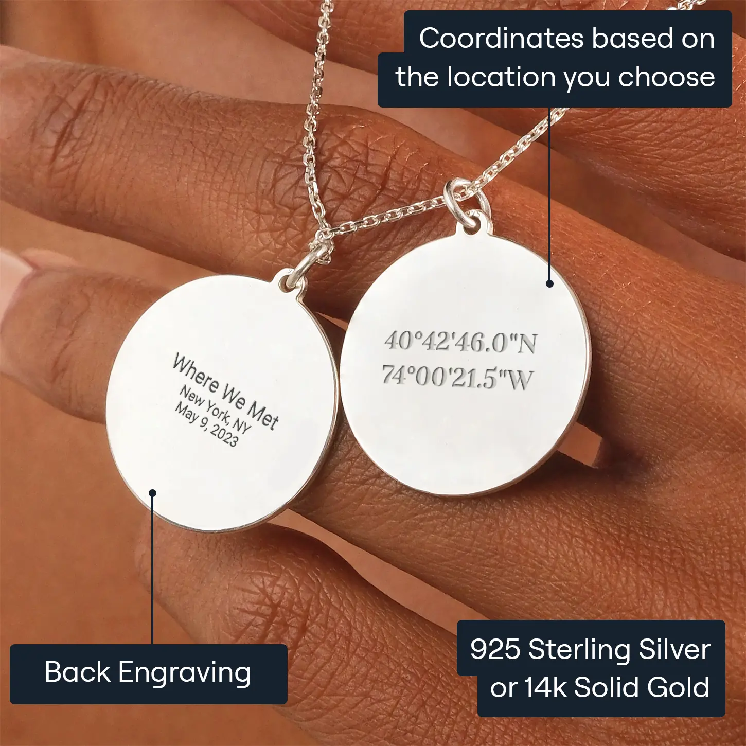With our Custom Coordinates Jewellery, you can capture the exact spot where your most precious moments unfolded. Using our intuitive online editor, simply choose your desired location and we'll engrave its coordinates onto the front of your pendant.