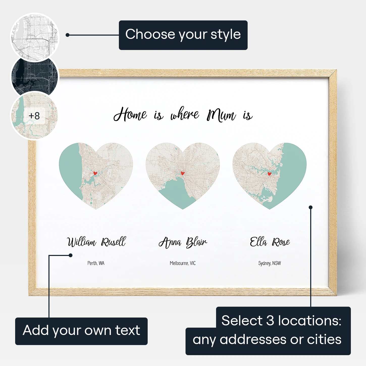 Home is where your mum is, and this beautiful custom Long Distance Mum Map helps you keep her close to your heart. This triple map format lets you customise three small maps within the same print — and the possibilities are endless!