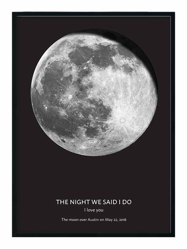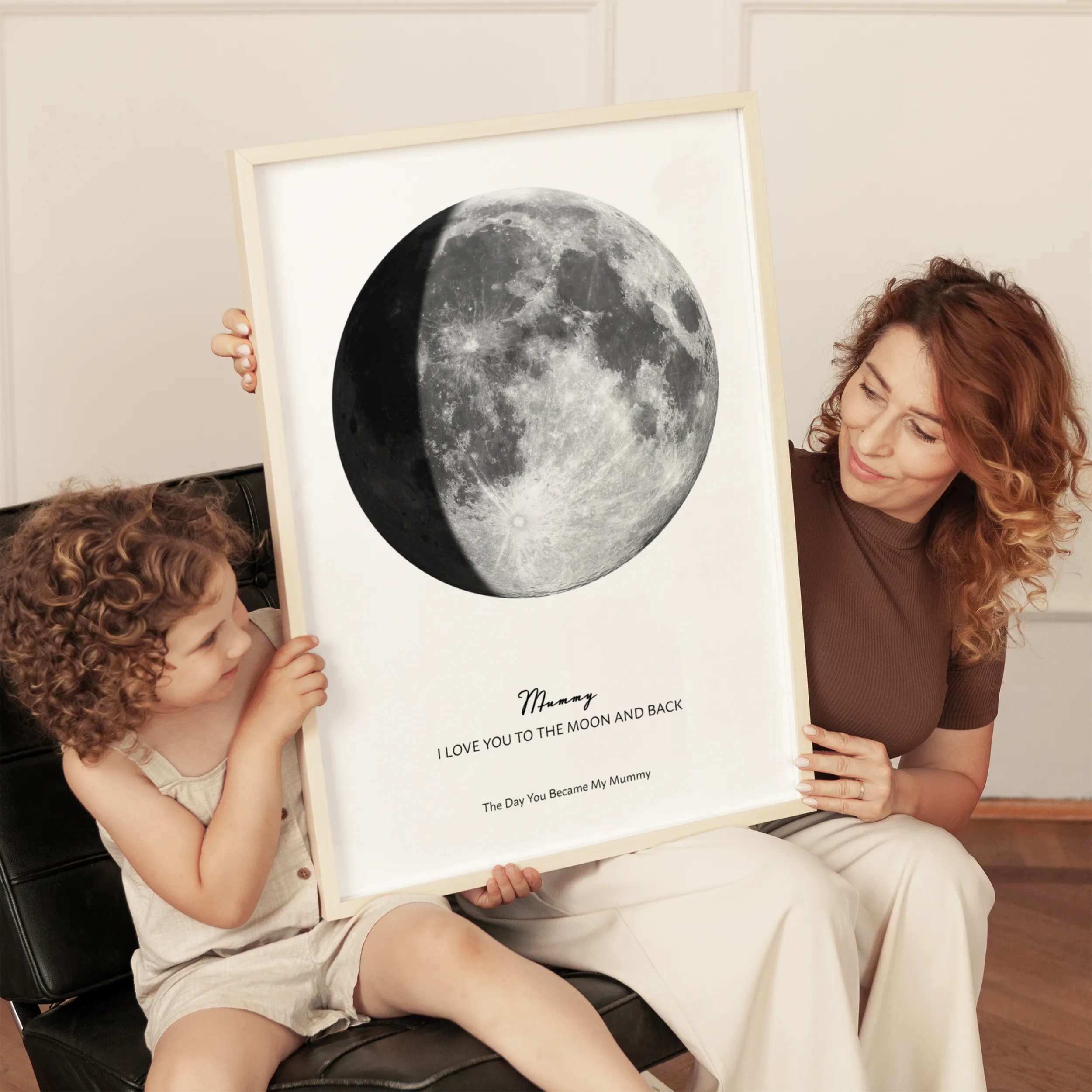 The 'Mommy, I love you to the moon and back' is a personalized moon print from the date and time of your choice. You can select any date and location, and see how the moon looked on that day. It’s a thoughtful way to show your mom how much you care, and it’s a gift she can cherish forever.