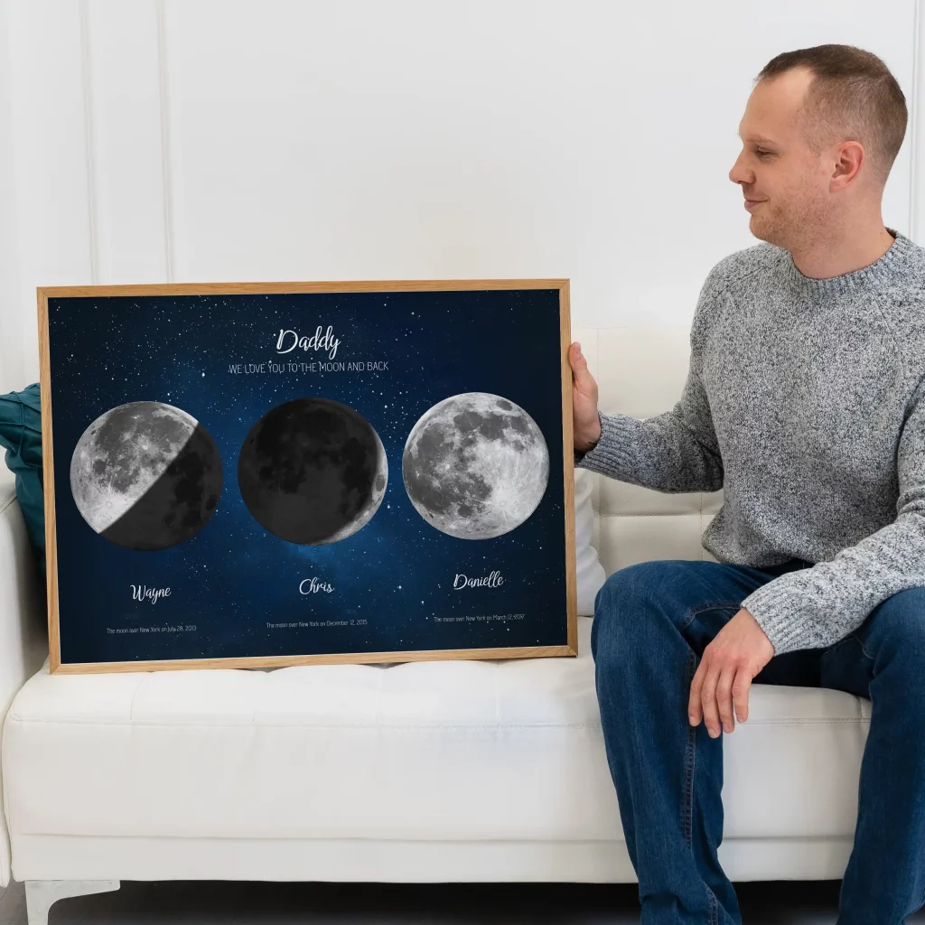 Don’t wait—turn those unforgettable moments into a stunning piece of art that Dad will treasure forever. Order your personalized Three Moons for Dad now and give a gift that’s truly out of this world.