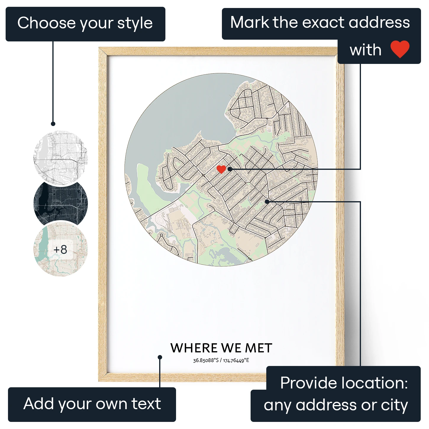 If you're looking for a gift that is both sentimental and visually stunning, then our custom print is an excellent choice. It's sure to be appreciated by anyone who receives it and will serve as a cherished keepsake for years to come. So whether you're celebrating a milestone in your relationship or simply want to show someone how much they mean to you, a Where We Met Circle Map is the perfect way to do so.