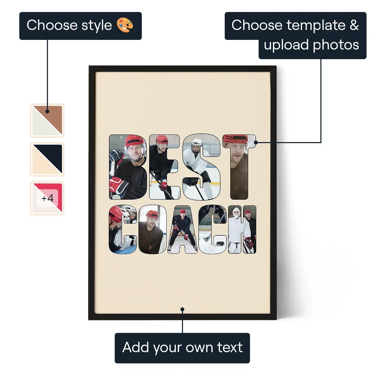 Turn team photos and memorable moments into a personalized collage that celebrates a coach’s leadership and creates a keepsake full of appreciation