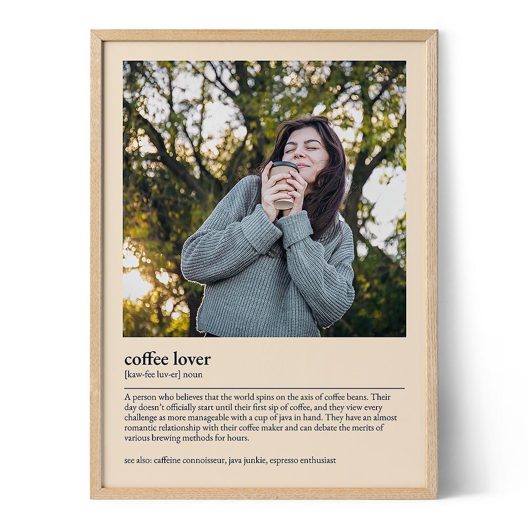 Looking for a witty and personalized gift for the coffee enthusiast in your life? Our Coffee Lover Definition Poster is an ideal choice. This custom print features your own photo alongside a humorous and creative dictionary-style definition of the word "coffee lover," celebrating their love for this beloved beverage in a unique and memorable way.