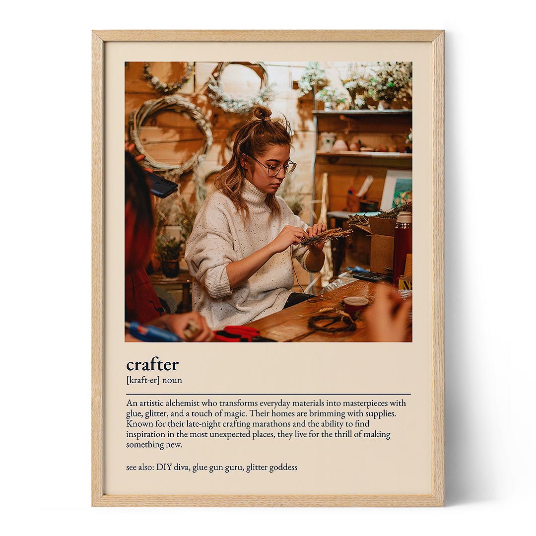 Looking for a delightful gift for the crafter in your life? Our Crafter Definition Poster is the perfect choice. This personalized print features your own photo and a dictionary definition of the word "crafter," ensuring a meaningful and humorous touch.