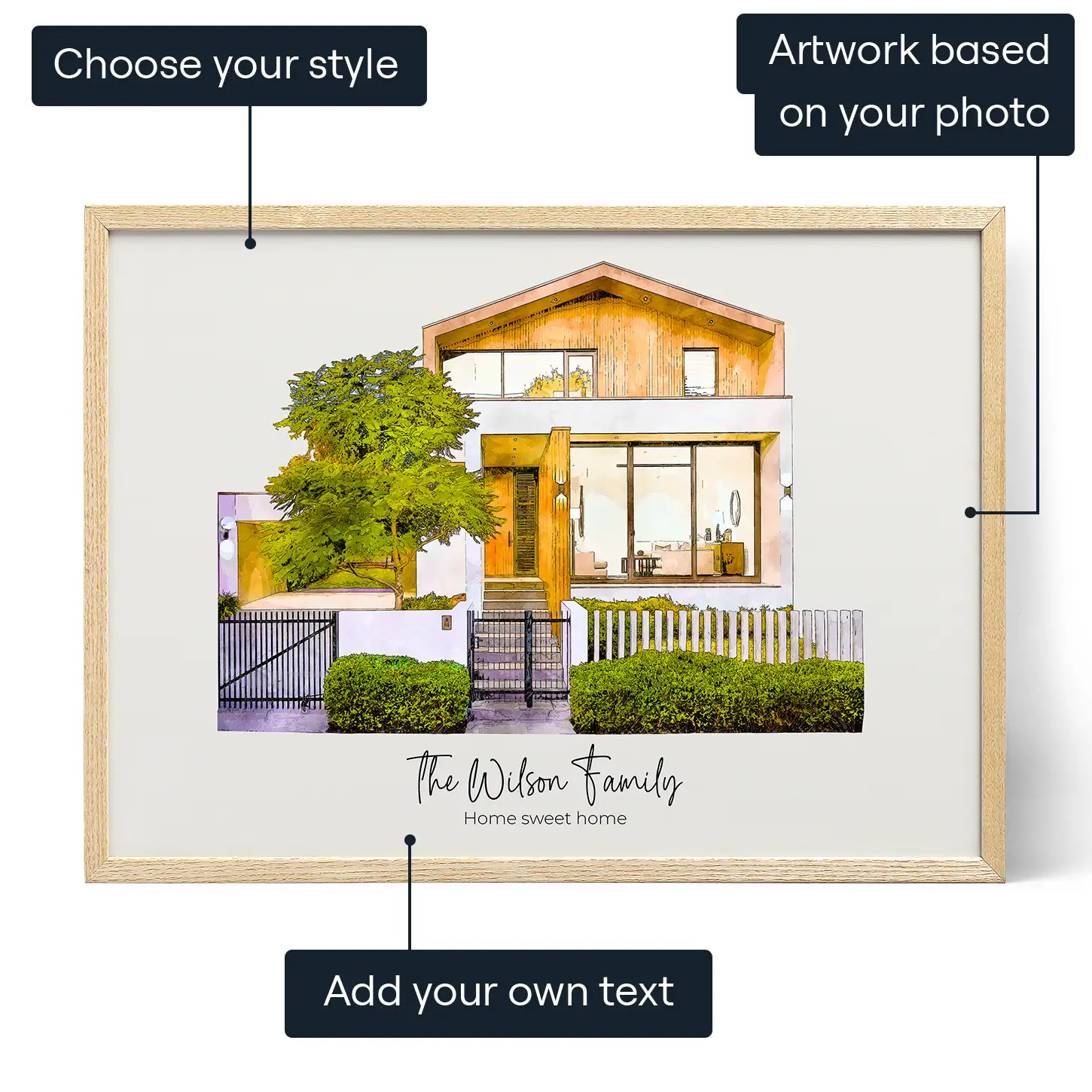 Transform your home’s photo into a personalized digital portrait, complete with custom text, creating the perfect milestone memento, whether it’s your first house or your forever home.