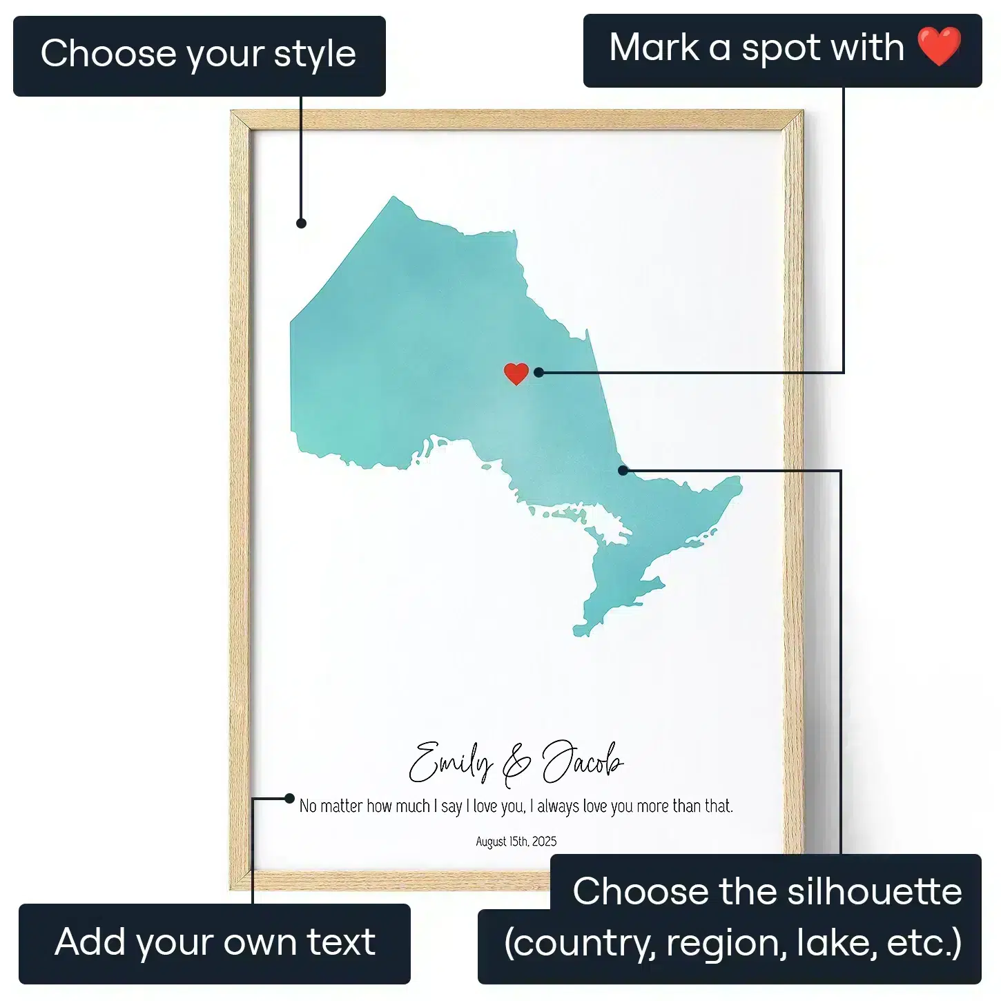 Our Custom Watercolor Map is a unique and creative way to capture cherished memories and locations. You start by selecting your preferred map style and colors. Choose from our preset watercolor themes or let your creativity flow by customizing the background and land colors. Next, pick a location from our extensive list, whether it's a country, state, or even the entire world. The magic truly happens when you add a heart-shaped marker to pinpoint a significant place, such as where you met, got engaged, or tied the knot. Beneath the marker, you can include a heartfelt message, a sweet sentence, or an inspiring quote. To top it all off, you can decide whether you want it as a framed print, canvas, or a digital file.