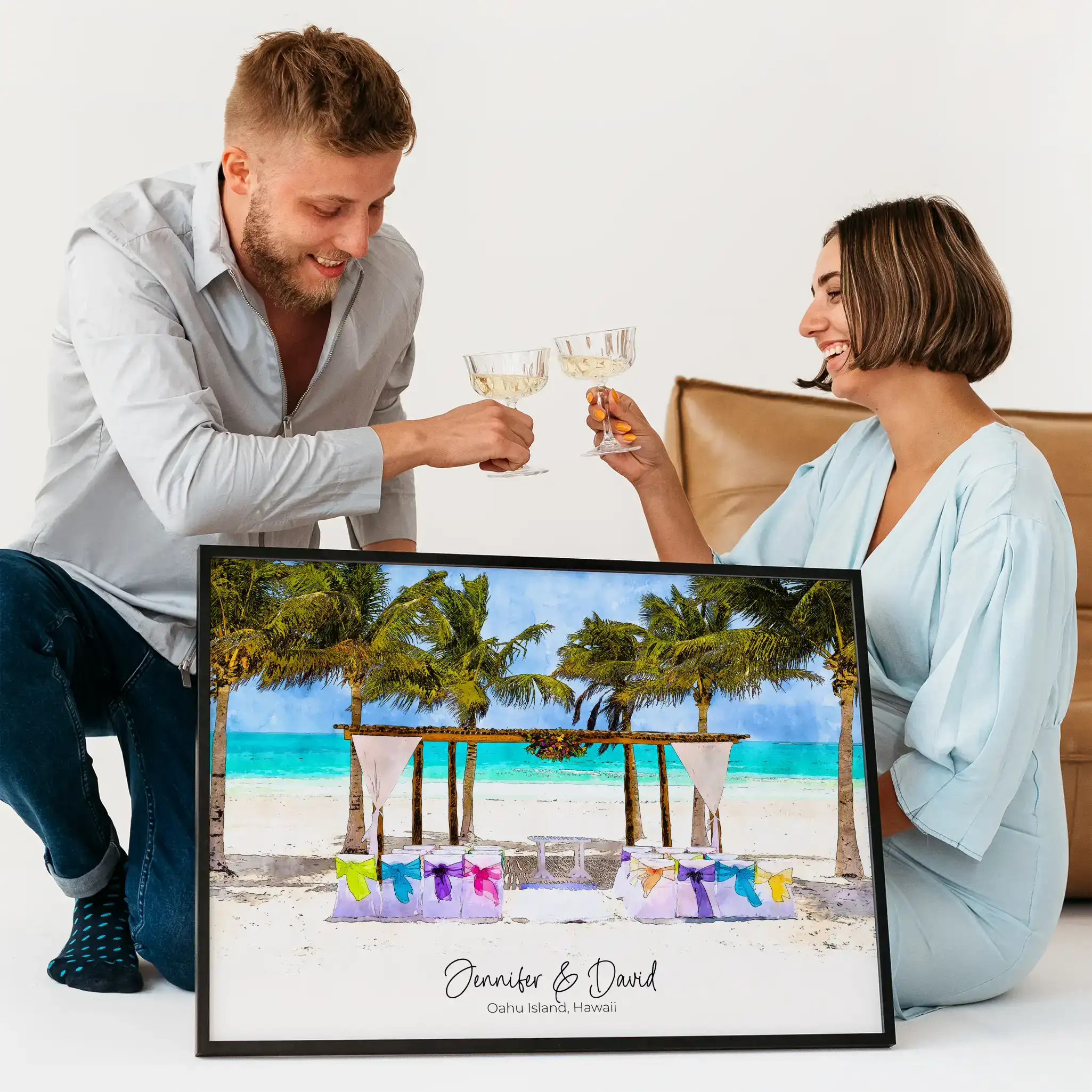 Capture your special day with a custom watercolour wedding venue portrait, beautifully crafted by our skilled artists