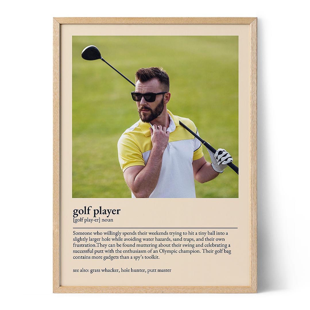 Looking for a unique and personalised gift for the golfer in your life? Our Golf Player Definition Poster is the perfect choice. This custom print features your own photo and a humorous or heartfelt dictionary definition of the word "golf player," making it a memorable and thoughtful gift.