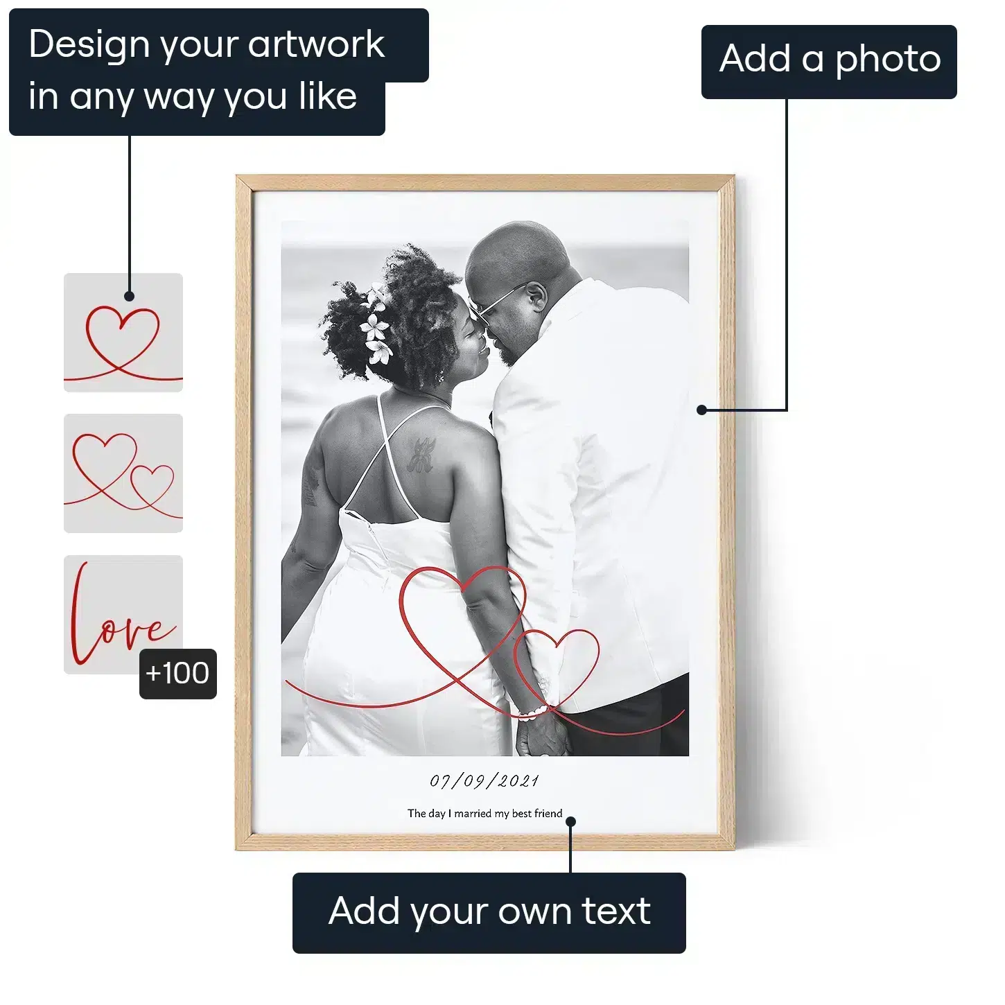 Select from a variety of common sizes, all printed on the highest quality materials that are ready for gifting. Choose from poster prints or canvas photo prints, or select a digital file that you can download and print locally. All of our personalized photo wall art gifts ship to anywhere in the world.