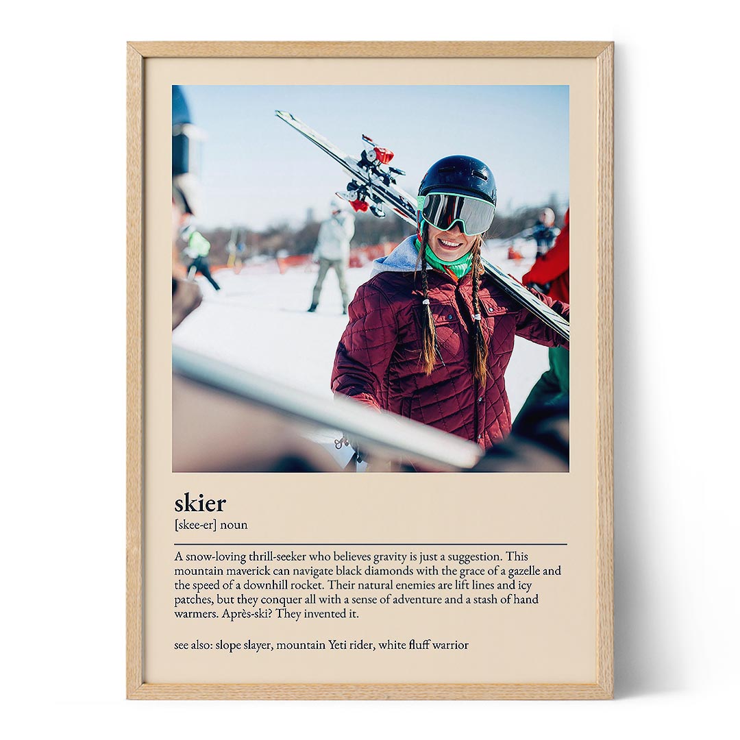 Celebrate the thrill of the slopes with our Skier Definition Poster. This personalized print combines your favorite photo with a humorous or heartfelt dictionary definition of the word "skier", creating a unique and memorable piece of art.