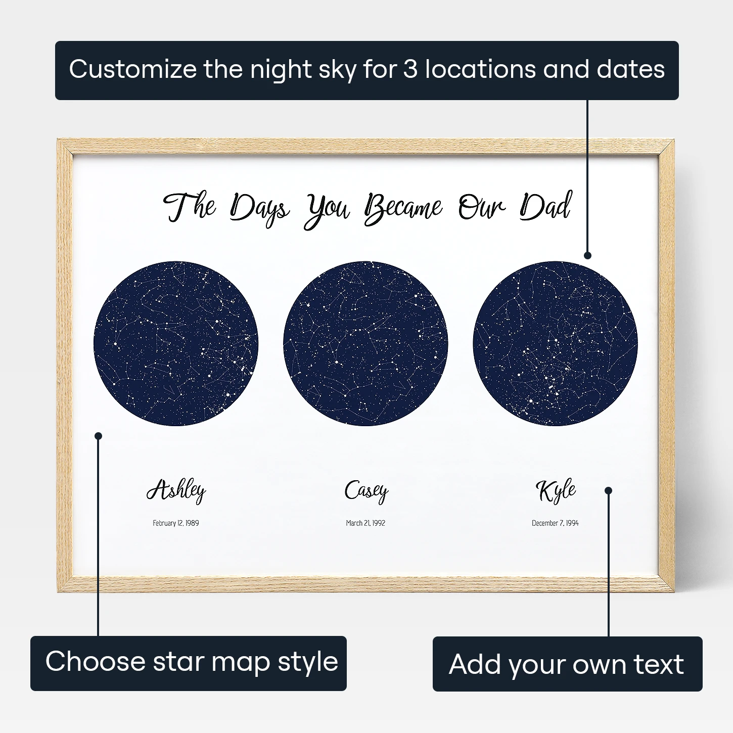 Featuring three beautiful star maps on a single poster, this gift is the perfect representation of the night sky on the day that each of his three children were born. With the option to also include other significant moments from his life, the possibilities for personalization are endless.